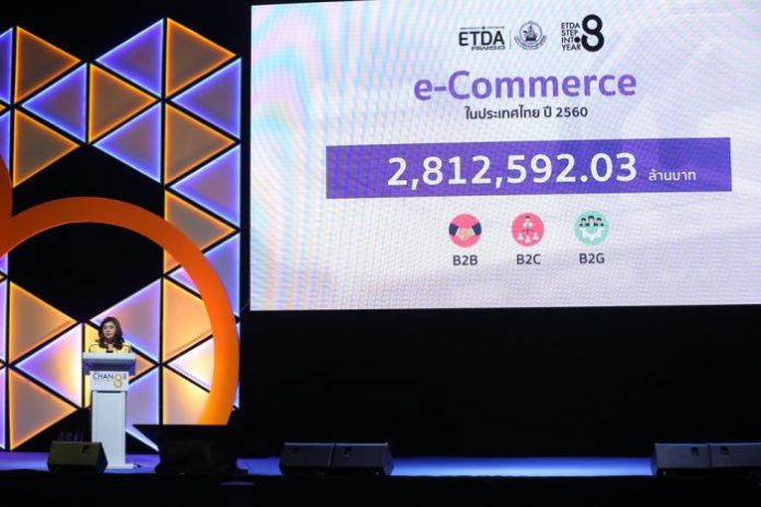 นางสุรางคณา วายุภาพ ผู้อำนวยการสำนักงานพัฒนาธุรกรรมทางอิเล็กทรอนิกส์ (องค์การมหาชน) หรือ ETDA กระทรวงดิจิทัลเพื่อเศรษฐกิจและสังคม เปิดเผยว่า ในปี 2560 ไทยมีมูลค่าอีคอมเมิร์ซทั้งสิ้น 2,812,592.03 ล้านบาท ซึ่งส่วนใหญ่เป็นมูลค่าอีคอมเมิร์ซประเภท B2B ประมาณ 1,675,182.23 ล้านบาท หรือคิดเป็น 59.56% รองลงมา เป็นมูลค่าของประเภท B2C จำนวนมากกว่า 812,612.68 ล้านบาท หรือ 28.89% และส่วนที่เหลือราว 324,797.12 ล้านบาท หรือ 11.55% เป็นมูลค่าตามธุรกิจประเภท B2G ซึ่งเมื่อเทียบมูลค่า อีคอมเมิร์ซของปี 2560 กับปี 2559 จะพบว่ามูลค่าของประเภท B2B มีการเติบโตขึ้น 8.63% เช่นเดียวกับประเภท B2C ที่โตขึ้น 15.54%