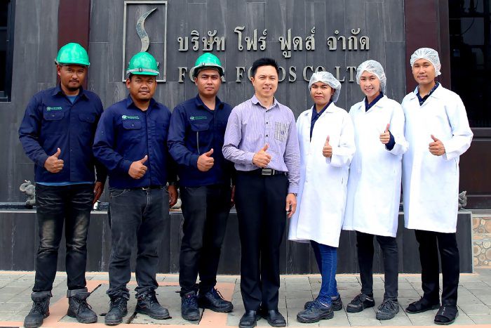 นายสมเจตน์ ปัญจวัฒนางกูร (กลาง) กรรมการผู้จัดการ บริษัท โฟร์ ฟูดส์ จำกัด ผู้ผลิตและจำหน่ายผงปรุงอาหาร แบรนด์ไทเชฟ ให้การต้อนรับนางสาวกรรณิการ์ มูลศรี (ที่ 3 จากขวา) เจ้าหน้าที่สิ่งแวดล้อม บริษัท อินเตอร์เนชั่นแนล เอ็นไวรอนเม็นทอล แมนเนจเม็นท์ จำกัดพร้อมทีมงาน ในโอกาสเข้าตรวจประเมินโรงงานภายใต้ “โครงการอุตสาหกรรมสีเขียว” ซึ่งเป็นโครงการดูแลสิ่งแวดล้อมภายในโรงงาน และบริเวณใกล้เคียง ถือเป็นพันธกิจที่บริษัทฯ ให้ความสำคัญและปฏิบัติอย่างต่อเนื่อง เพื่อร่วมรักษาคุณภาพชีวิตที่ดีของพนักงานและชุมชน ณ บริษัท โฟร์ ฟูดส์ ลำลูกกา จังหวัดปทุมธานี