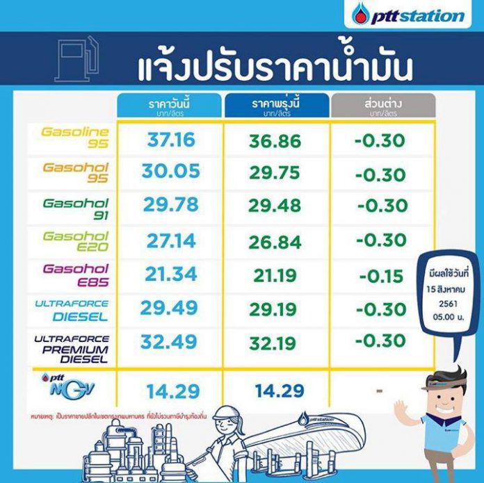 การประกาศลดราคาน้ำมันของ ปตท.และ บมจ.บางจาก ในครั้งนี้จะยกเว้น E85 ปรับขึ้น 15 สตางค์/ลิตร โดยมีผลตั้งแต่วันที่ 15 ส.ค. 2561 เวลา 05.00 น. ส่งผลให้มีราคาขายปลีกน้ำมันที่สถานีทั้งสองแห่งมีราคาดังนี้ เบนซิน ราคา 36.86 บาท/ลิตร แก๊สโซฮอล 95 ราคา 29.75 บาท/ลิตร แก๊สโซฮอล 91 ราคา 29.48 บาท/ลิตร E20 ราคา 26.84 บาท/ลิตร E85 ราคา 21.19 บาท/ลิตร ดีเซล ราคา 29.19 บาท/ลิตร (ราคานี้ยังไม่รวมภาษีท้องที่ของแต่ละจังหวัด)