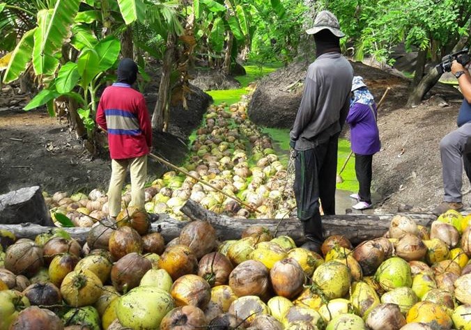 ด้าน นายกิตติวงศ์ แสงสุวรรณ แกนนำเครือชาวสวนมะพร้าว อ.ทับสะแก กล่าวว่า ขณะนี้ผู้ประกอบการรับซื้อผลผลิตหรือ “ล้งมะพร้าว” ในจังหวัดประสบปัญหาผลผลิตตกค้างกว่า 10 ล้านผล ทำให้ไม่สามารถรับซื้อผลผลิตจากชาวสวนได้ตามปกติ ขณะที่เจ้าของ “ล้ง” ยอมขาดทุนด้วยการนำมะพร้าวงอกไปแปรรูปเป็นน้ำมันมะพร้าว และ ชาวสวนต้องนำมะพร้าวผลไปแปรรูปเป็นมะพร้าวขาวเพื่อขายให้โรงงานผลิตน้ำกะทิส่งออก โดยโรงงานรับซื้อแต่จำกัดโควต้า