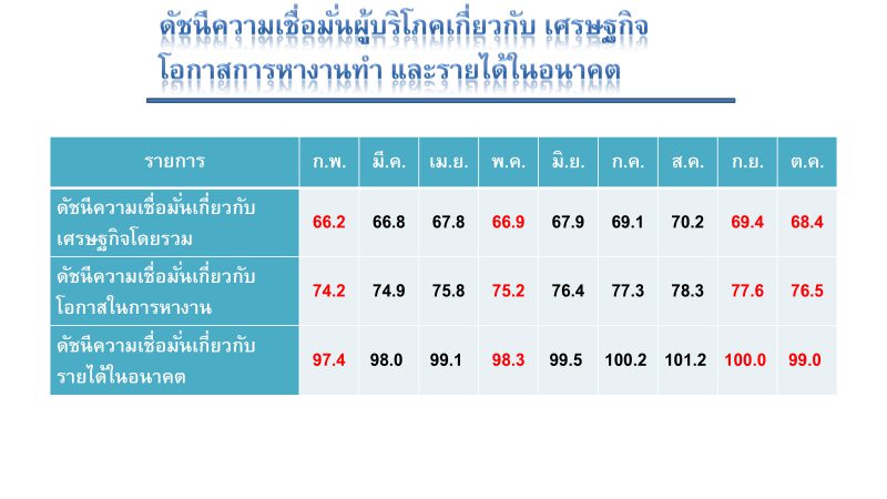 ทั้งนี้ ดัชนีความเชื่อมั่นเกี่ยวกับเศรษฐกิจโดยรวม ดัชนีความเชื่อมั่นเกี่ยวกับโอกาสหางานทำโดยรวม และดัชนีความเชื่อมั่นเกี่ยวกับรายได้ในอนาคตอยู่ที่ระดับ 68.4 76.5 และ 99.0 ตามลำดับ โดยปรับตัวลดลงทุกรายการ เมื่อเทียบกับดัชนีในเดือนกันยายน 2561 ที่อยู่ในระดับ 69.4 77.6 และ 100.0 ตามลำดับ ทั้งนี้ ดัชนียังอยู่ในระดับต่ำกว่าปกติ (ที่ระดับ 100) แสดงว่าผู้บริโภคยังไม่มีความมั่นใจเกี่ยวกับสถานการณ์ทางเศรษฐกิจ โอกาสในการหางานทำ และรายได้ในอนาคตมากนัก