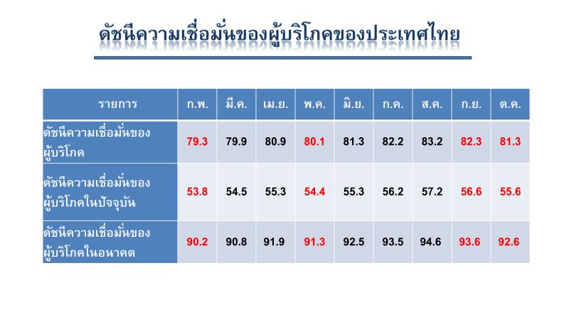 สำหรับความเชื่อมั่นของผู้บริโภคในปัจจุบันปรับตัวลดลงจากระดับ 56.6 มาอยู่ที่ระดับ 55.6 แสดงว่าภาวะเศรษฐกิจไทยในปัจจุบันยังไม่ดีเท่าที่ควร ขณะที่ดัชนีความเชื่อมั่นของผู้บริโภคในอนาคต (ในระยะ 6 เดือนข้างหน้า) ปรับตัวลดลงเช่นเดียวกัน โดยปรับตัวลดลงจากระดับ 93.6 มาอยู่ที่ระดับ 92.6 ซึ่งยังปรับตัวอยู่ใกล้เคียงระดับ 100 (ซึ่งเป็นระดับปกติ) มากขึ้น สะท้อนให้เห็นว่าผู้บริโภคยังมีความเชื่อมั่นว่าเศรษฐกิจไทยจะปรับตัวดีขึ้นในอนาคตอันใกล้