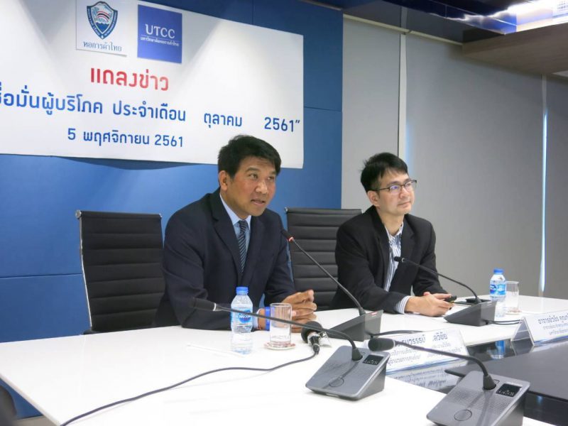 ผศ.ดร.ธนวรรธน์ พลวิชัย ผู้อำนวยการศูนย์พยากรณ์เศรษฐกิจและธุรกิจ มหาวิทยาลัยหอการค้าไทย และ นายวชิร คูณทวีเทพ ผู้ช่วยผู้อำนวยการ ร่วมแถลงข่าว ผลของการสำรวจความเชื่อมั่นของผู้บริโภคในเดือนตุลาคม 2561 โดยดัชนีความเชื่อมั่นของผู้บริโภคปรับตัวลดลงต่อเนื่องเป็นเดือนที่ 2 นับเนื่องจากผู้บริโภครู้สึกว่าราคาน้ำมันปรับตัวสูงขึ้นส่งผลให้อำนาจซื้อลดน้อยลง ประกอบกับราคาพืชผลทางการเกษตรหลายรายการยังมีราคาต่ำ นักท่องเที่ยวจีนที่เข้ามาท่องเที่ยวในประเทศไทยลดน้อยลง และสถานการณ์สงครามการค้าระหว่างสหรัฐฯ กับจีนที่มีเริ่มรุนแรงมากขึ้น ส่งผลให้กำลังซื้อในปัจจุบันชะลอตัวลง และความเชื่อมั่นในอนาคตปรับตัวลดลง