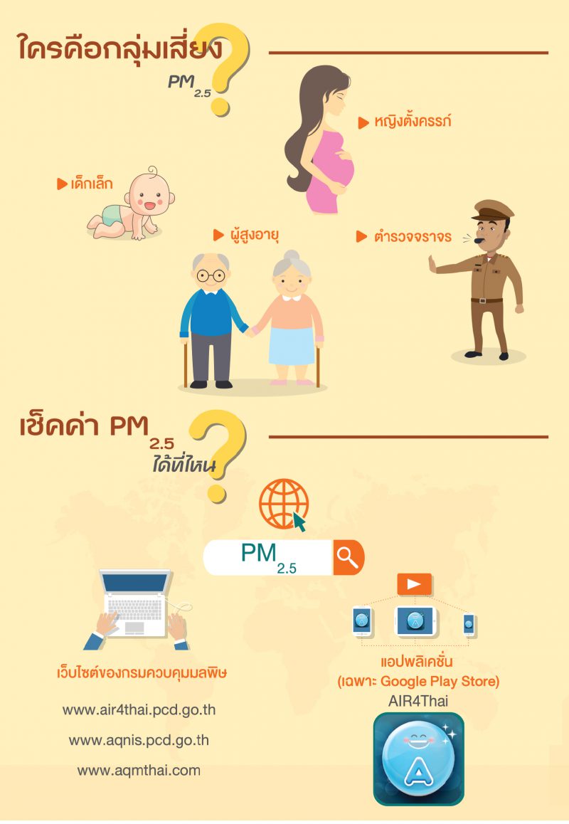 อย่างไรก็ตาม กลุ่มเสี่ยงที่ต้องเฝ้าระวังเป็นพิเศษ คือ กลุ่มผู้สูงอายุ หญิงตั้งครรภ์ เด็กเล็ก กลุ่มผู้ที่ทำงานนานกว่า 12 ชั่วโมงในที่โล่งแจ้ง และผู้ป่วยด้วยโรคระบบทางเดินหายใจ หอบหืด ภูมิแพ้ และโรคเกี่ยวกับหัวใจและหลอดเลือด ซึ่งฝุ่นละอองขนาดเล็กนั้น อาจทำให้เสี่ยงต่อการเกิดโรคระบบทางเดินหายใจ โรคหัวใจและหลอดเลือด โรคเยื่อบุตาอักเสบ และโรคผิวหนัง