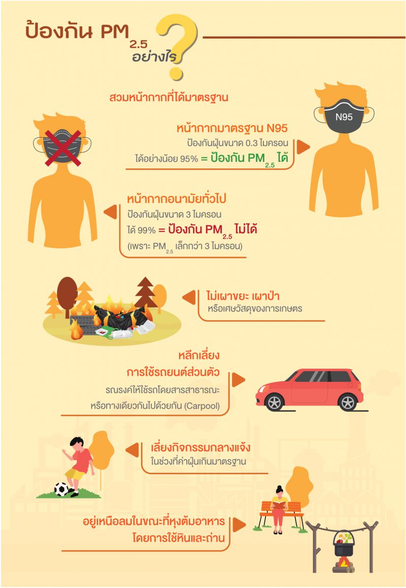 3.ใช้หน้ากากที่มีประสิทธิภาพในการกรองอนุภาคที่มีขนาดเล็กกว่า 0.3 ไมครอนได้ เช่น N95, P100 4.เลี่ยงการออกกำลังกายหรือทำงานนานกว่า 12 ชั่วโมงในที่โล่งแจ้ง 5.ลดการใช้รถยนต์และการเผาขยะ ถ้ามีอาการผิดปกติ เช่น หายใจติดขัด แน่นหน้าอก วิงเวียนศีรษะ หรือหมดสติ ให้รีบไปรับการตรวจรักษาที่สถานพยาบาลโดยเร็ว หากประชาชนมีข้อสงสัยสามารถสอบถามข้อมูลเพิ่มเติมได้ที่สายด่วนกรมควบคุมโรค โทร. 1422