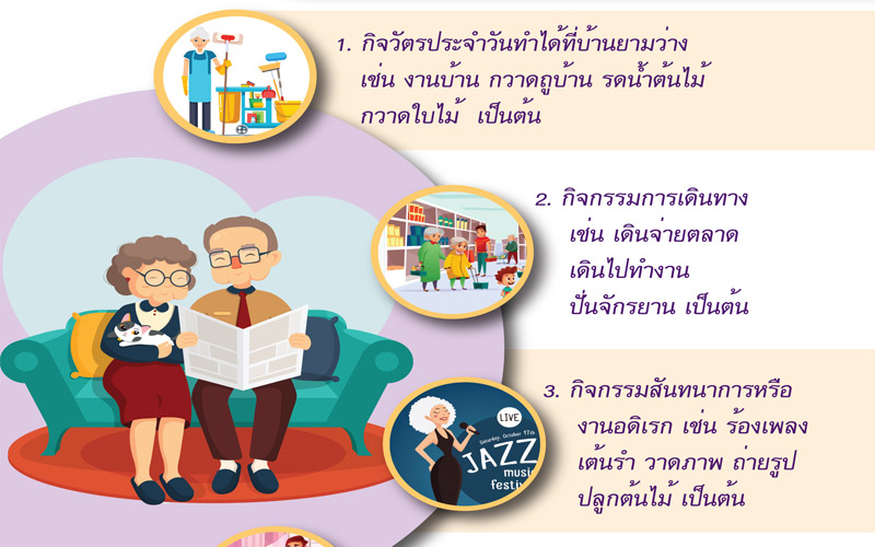 นายแพทย์สกานต์ บุนนาค รักษาราชการแทนผู้อำนวยการสถาบันเวชศาสตร์สมเด็จพระสังฆราชญาณสังวรเพื่อผู้สูงอายุ กรมการแพทย์ กล่าวเพิ่มเติมว่า ผู้สูงอายุควรเพิ่มกิจกรรมทางกายในชีวิตประจำวัน และลดพฤติกรรม เช่น นั่งๆ นอนๆ ดูทีวี หรือเล่น social media เป็นเวลาทีละนานๆ เป็นต้น โดยรูปแบบกิจกรรมทางกายที่ผู้สูงอายุสามารถปฏิบัติได้ ดังนี้ 1.กิจวัตรประจำวันที่ทำด้วยตนเองที่บ้านหรือในยามว่าง ได้แก่ งานบ้าน กวาดถูบ้าน รดน้ำต้นไม้ กวาดใบไม้ 2.กิจกรรมการเดินทาง ได้แก่ การเดินไปจ่ายตลาด การเดินไปทำงาน ปั่นจักรยาน 3.กิจกรรมสันทนาการหรืองานอดิเรก เพื่อผ่อนคลายความตึงเครียดทางร่างกาย ส่งเสริมสุขภาพจิตใจและสมอง เช่น การร้องเพลง เต้นรำ วาดภาพ ถ่ายรูป ปลูกต้นไม้ 4.การออกกำลังกายง่ายๆ เช่น ลีลาศ รำไทเก๊ก รำไม้พลอง