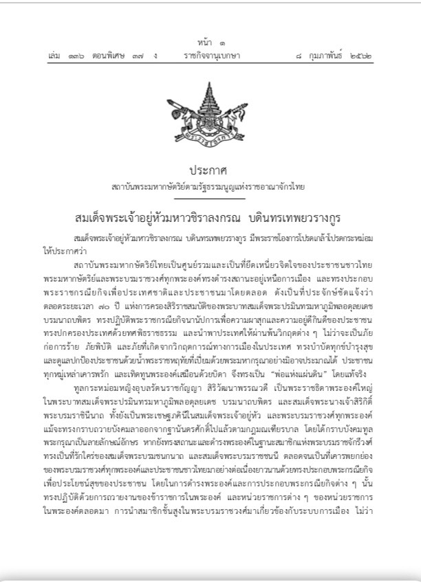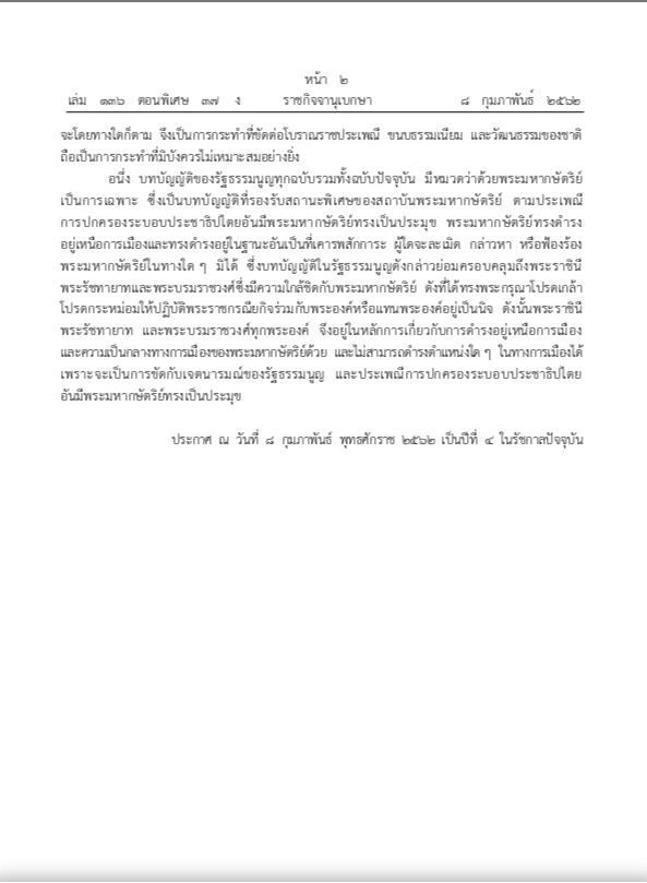 วันที่ 8 ก.พ.2562 สมเด็จพระเจ้าอยู่หัวมหาวชิราลงกรณ บดินทรเทพยวรางกูร มีพระราชโองการโปรดเกล้าโปรดกระหม่อมให้ประกาศว่า สถาบันพระมหากษัตริย์ไทยเป็นศูนย์รวมและเป็นที่ยึดเหนี่ยวจิตใจของประชาชนชาวไทย พระมหากษัตริย์และพระบรมราชวงศ์ทุกพระองค์ทรงดำรงสถานะอยู่เหนือการเมือง และทรงประกอบพระราชกรณียกิจเพื่อประเทศชาติและประชาชนมาโดยตลอด ดังเป็นที่ประจักษ์ชัดแจ้งว่า ตลอดระยะเวลา 70 ปี แห่งการครองสิริราชสมบัติของพระบาทสมเด็จพระปรมินทรมหาภูมิพลอดุลยเดช บรมนาถบพิตร ทรงปฏิบัติพระราชกรณียกิจนานัปการเพื่อความผาสุกและความอยู่ดีกินดีของประชาชน ทรงปกครองประเทศด้วยทศพิธราชธรรม และนาพาประเทศให้ผ่านพ้นวิกฤตต่าง ๆ ไม่ว่าจะเป็นภัย ก่อการร้าย ภัยพิบัติ และภัยที่เกิดจากวิกฤตการณ์ทางการเมืองในประเทศ ทรงบำบัดทุกข์บารุงสุข และดูแลปกป้องประชาชนด้วยนำพระราชหฤทัยที่เปี่ยมด้วยพระมหากรุณาอย่างมิอาจประมาณได้ ประชาชนทุกหมู่เหล่าเคารพรัก และเทิดทูนพระองค์เสมือนด้วยบิดา จึงทรงเป็น “พ่อแห่งแผ่นดิน” โดยแท้จริง