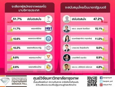เมื่อถามว่าในการเลือกตั้งครั้งนี้ ตั้งใจจะเลือกผู้สมัครจากพรรคใดมาบริหารประเทศ ร้อยละ 11.7 ระบุ พรรคเพื่อไทย เพิ่มขึ้นจากผลสำรวจครั้งก่อน ร้อยละ 2.4 รองลงมาคือพรรคประชาธิปัตย์ ร้อยละ 10.6 เพิ่มขึ้นจากครั้งก่อนร้อยละ 4.3 และ พรรคพลังประชารัฐ ร้อยละ 10.2 เพิ่มขึ้นจากครั้งก่อนร้อยละ 3.2 ขณะที่ส่วนใหญ่ ร้อยละ 51.7 ยังไม่ตัดสินใจ ซึ่งลดลงจากครั้งก่อนร้อยละ 14.5