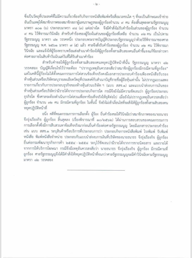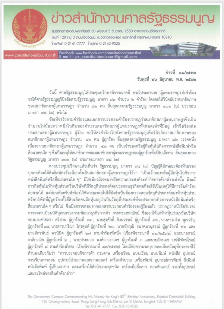 ศาลรัฐธรรมนูญ พิจารณาคำร้องของประธานสภาผู้แทนราษฎร ขอให้วินิจฉัย ส.ส. 41 คน ขาดคุณสมบัติ เนื่องจากถือหุ้นสื่อ โดยมีมติรับคำร้อง ส.ส. 32 คน ไว้พิจารณา และมีมติไม่รับคำร้อง ส.ส. 9 คน