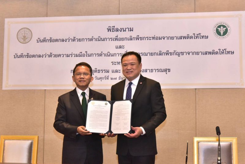 สำหรับบันทึกข้อตกลงฯ เพื่อยกเลิกพืชกระท่อม และพิจารณายกเลิกพืชกัญชาจากยาเสพติดให้โทษ เป็นการกำหนดขอบเขตความร่วมมือระหว่าง 2 กระทรวง โดยได้พิจารณา เสนอแนะแนวทาง รวมถึงรวบรวมข้อมูลกฏหมายและข้อมูลทางวิชาการเสนอต่อรัฐบาลเพื่อประกอบการเสนอร่างกฎหมายเพื่อการยกเลิกพืชกระท่อมจากยาเสพติด นอกจากนี้ยังศึกษาสภาพปัญหา แนวทางการยกเลิกพืชกัญชาจากกฎหมายเพื่อประโยชน์ทางการแพทย์ อีกทั้งพิจารณา ให้ความเห็นแนวทางการสนับสนุนให้บุคลากรทางการแพทย์และประชาชนใช้ประโยชน์ จากพืชกัญชาอย่างถูกต้อง ตลอดจนมาตรการควบคุมที่เหมาะสมกับประเทศไทย