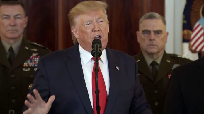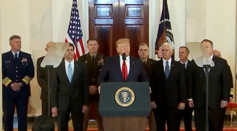 นายโดนัลด์ ทรัมป์ ประธานาธิบดี สหรัฐอเมริกา แถลงจากทำเนียบขาว ในวันพุธที่ 8 ม.ค.63 เวลา 23.00 น.(ตามเวลาในประเทศไทย) กล่าวโดยสรุป ถึงการโจมตีฐานทัพสหรัฐ 2 แห่งในอิรัก โดยอิหร่านเพื่อแก้แค้นให้นายพลกอเซ็ม สุไลมานี (ความโดยสรุป) ว่า เราไม่ได้รับบาดเจ็บเลย ทหารของเราทุกคนปลอดภัย และความเสียหายเพียงเล็กน้อยเท่านั้นที่เกิดขึ้นที่ฐานทัพของเรา อิหร่าน ดูเหมือนจะถอยกลับ และยินดีกับมัน อิหร่านต้องหยุดสนับสนุนการก่อการร้าย