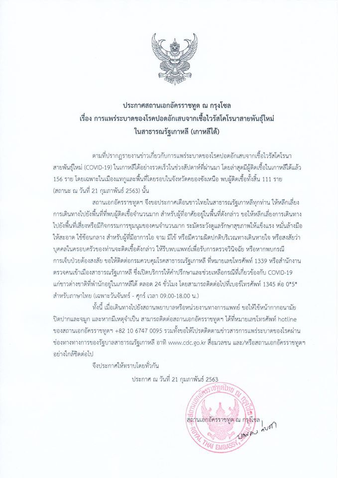 สถานเอกอัคราชทูตไทย ณ กรุงโซล ออกประกาศ เรื่อง การแพร่ระบาดของโรคปอดอักเสบจากเชื้อไวรัสโคโรนาสายพันธุ์ใหม่ ในสาธารณรัฐเกาหลี (เกาหลีใต้) แนะหลีกเลี่ยงการเดินทางไปเกาหลีใต้ ความว่า “เรื่อง การแพร่ระบาดของโรคปอดอักเสบจากเชื้อไวรัสโคโรนาสายพันธุ์ใหม่ ในสาธารณรัฐเกาหลี (เกาหลีใต้) ตามที่ปรากฏรายงานข่าวเกี่ยวกับการแพร่ระบาดของโรคปอดอักเสบจากเชื้อไวรัสโคโรนาสายพันธุ์ใหม่ (COVD-19) ในเกาหลีไต้อย่างรวดเร็วในช่วงสัปตห์ที่ผม โดยส่สุดมีผู้ติดเชื้อในเกาหลีไต้แล้ว156 ราย โดยเฉพาะในเมืองแทกูและพื้นที่โดยรอบในจังหวัดคยองชังเหนือ พบผู้ติดเชื้อทั้งสิ้น 111 ราย (สถานะ ณ วันที่ 21 กุมภาพันธ์ 2563) นั้น