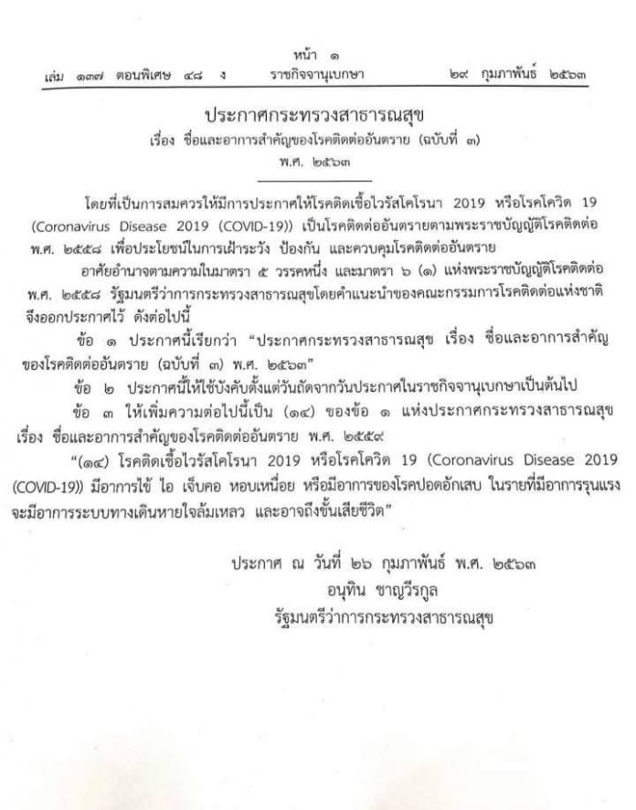 ประกาศให้โรคโควิด-19 เป็นโรคติดต่ออันตราย โดย กองบรรณาธิการ - 29 กุมภาพันธ์ 2020 FacebookTwitterLINE เว็บไซต์ราชกิจจานุเบกษา ประกาศให้โรคติดเชื้อไวรัสโคโรนา 2019 หรือโรคโควิด-19 เป็นโรคติดต่ออันตราย ตามประกาศกระทรวงสาธารณสุข เพื่อประโยชน์ในการเฝ้าระวัง ป้องกัน และควบคุมโรคติดต่ออันตราย มีผลบังคับใช้วันที่ 1 มีนาคม 2563 เป็นต้นไป Advertisement