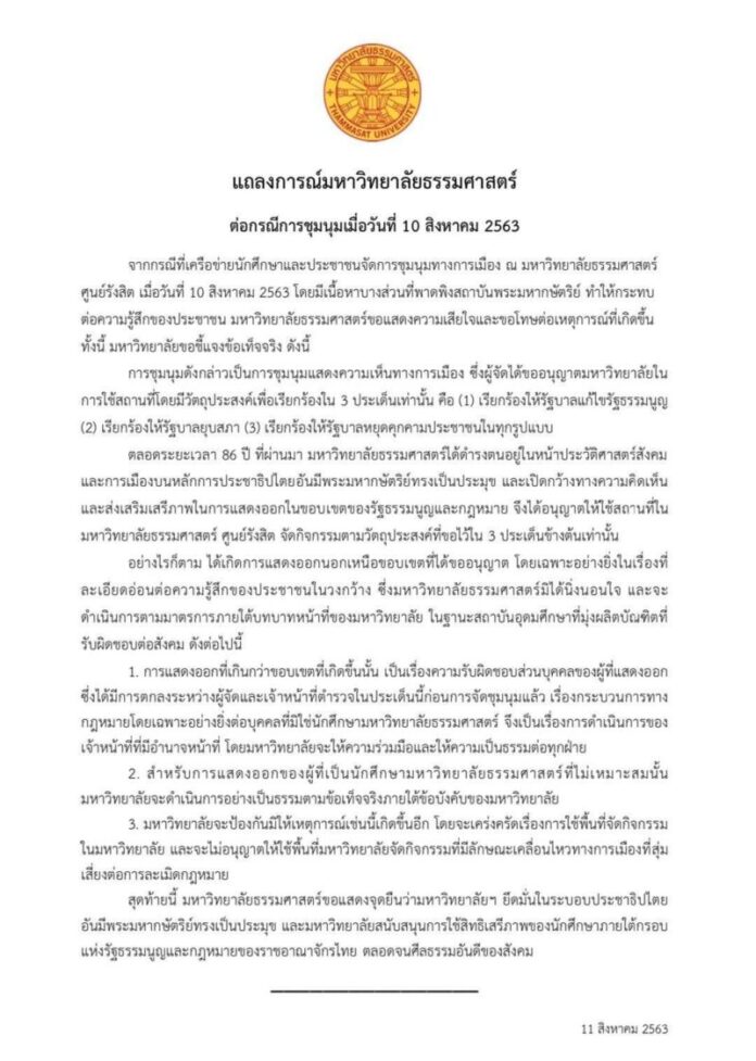 แถลงการณ์ระบุถึงความไม่สบายใจในเนื้อหาการชุมนุมที่มีเนื้อหาบางส่วนพาดพิงสถาบันพระมหากษัตริย์ ทำให้กระทบต่อความรู้สึกของประชาชน มหาวิทยาลัยธรรมศาสตร์ขอแสดงความเสียใจและขอโทษต่อเหตุการณ์ที่เกิดขึ้น (10 ส.ค.63)