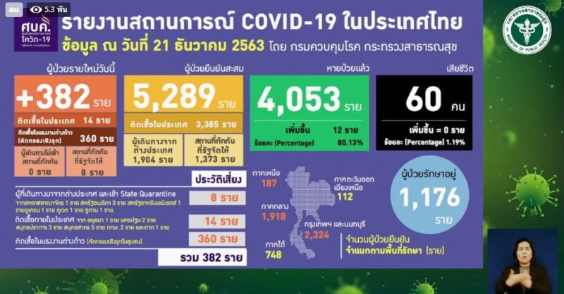 นายแพทย์ทวีศิลป์ วิษณุโยธิน โฆษกศูนย์บริหารสถานการณ์การแพร่ระบาดของโรคติดเชื้อไวรัสโคโรน่า 2019 (ศบค.) แถลงสถานการณ์แพร่ระบาดของโรคโควิด-19 ประจำวัน ว่า ประเทศไทยพบจำนวน ผู้ติดเชื้อรายใหม่เพิ่ม 382 ราย ยอดผู้ป่วยสะสม 5,289 ราย ไม่พบผู้เสียชีวิตเพิ่ม รวมยอดผู้เสียชีวิต 60 ราย ผู้ป่วยที่รักษาหายแล้ว 4,053 ราย ยังคงรักษาตัวอยู่ในโรงพยาบาล 1,176 ราย