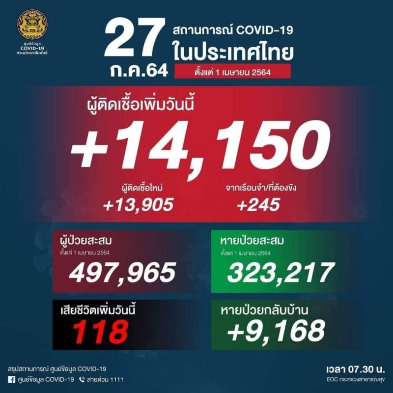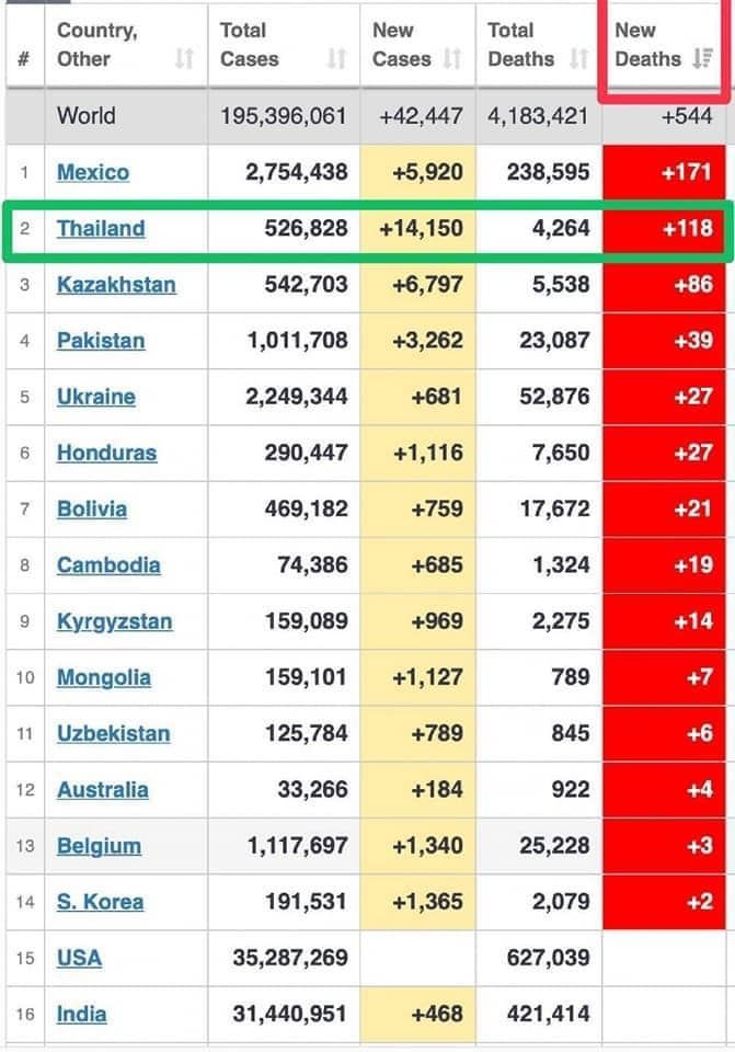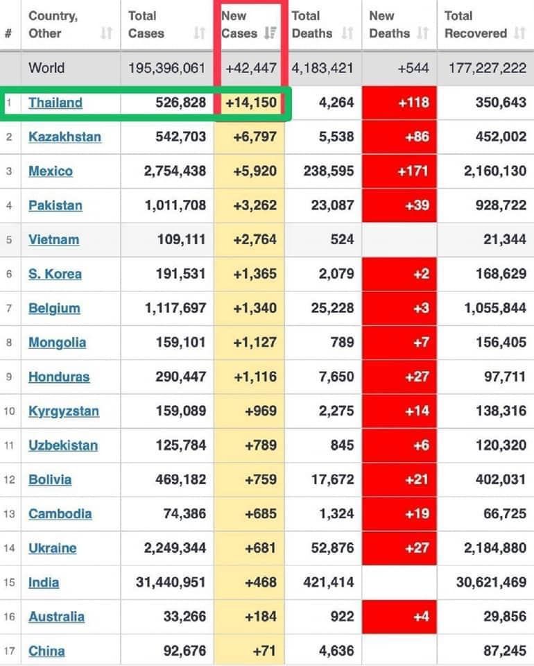 คุณหญิงสุดารัตน์ เกยุราพันธุ์ ประธานพรรคไทยสร้างไทย โพสต์ผ่านเพจ “คุณหญิงสุดารัตน์ เกยุราพันธุ์ Sudarat Keyuraphanโดยมีข้อความระบุว่า “วันนี้ประเทศไทยมีผู้ติดเชื้อใหม่ และเสียชีวิตสูงเป็นลำดับต้นๆของโลก ที่ 14,150 ราย และมีผู้เสียชีวิตที่ 118 ราย (จากข้อมูล ณ.ช่วงเวลา 13:14 น. ของ https://www.worldometers.info)