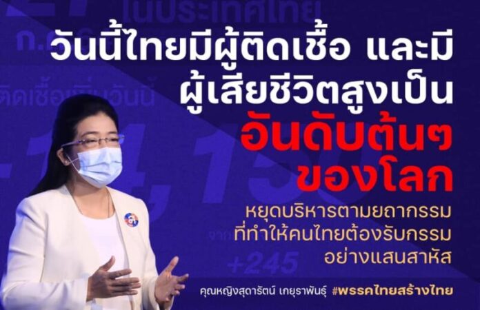 ชี้ให้เห็นว่าสถานการณ์ของไทยเราวิกฤตหนักมากแล้ว และยังไม่มีทีท่าว่าจะดีขึ้น ในขณะที่ประเทศอื่นทั่วโลกอยู่ขาลงของโควิด แต่ประเทศไทยกำลังทะยานขึ้นอย่างน่ากลัว จึงจำเป็นอย่างยิ่งที่นายกรัฐมนตรี ต้องตระหนักถึงความทุกข์ยากอย่างแสนสาหัสของประชาชน ที่เกิดจากความล้มเหลวในการบริหารจัดการโควิดของรัฐบาล จนทำให้ระบบสาธารณสุขของไทยที่ถือว่าดีติดอันดับโลก ต้องล่มสลาย หมอ พยาบาล เจ้าหน้าที่สาธารณสุขต้องทำงานหนักจนแทบจะไม่ไหวแล้วต้องเร่งปรับการทำงาน แก้ไขปัญหาตามที่พรรคไทยสร้างไทยได้เสนอพิมพ์เขียวไปแล้ว โดย