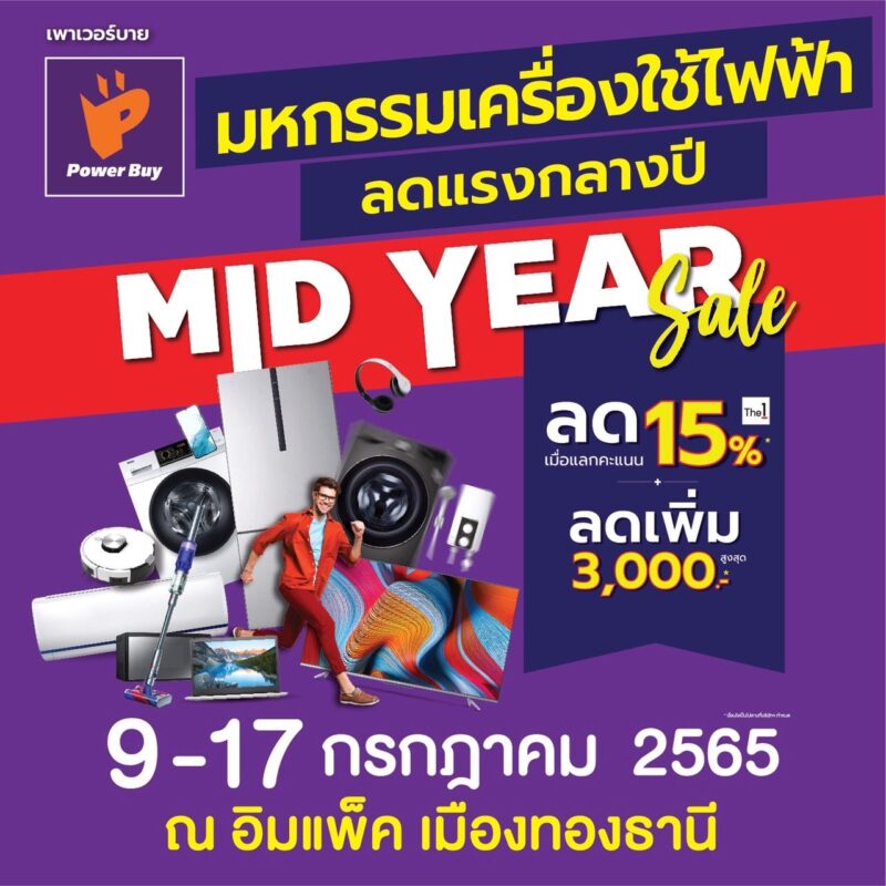2.งาน Power Buy Mid Year Sale งานที่มีเครื่องใช้ไฟฟ้าแบรนด์ชั้นนำมากที่สุด ในเครือเพาเวอร์บาย (Power Buy) ตั้งแต่ชิ้นเล็ก-ชิ้นใหญ่สุด มาให้เลือกมากกว่า 10,000 ชิ้น อาทิ ซัมซุง, แอลจี, โซนี่, ฮิตาชิ, มิตซูบิชิ, พานาโซนิค, ไดกิ้น, อิเลคโทรลักซ์, ชาร์ป, ลัคกี้เฟม, เบโค ฯลฯ มาจัดโปรโมชั่น ลดที่นี่จัดเต็ม ทั้งลดราคาสินค้า, เปิดตัวสินค้าใหม่, มอบส่วนลดพิเศษเพิ่มเติม 10% ช้อป 10,000 ลด 1,000 บาท นอกจากนี้ยังมีสถาบันการเงินมาร่วมจัดแคมเปญผ่อน 0% ให้ทั้งงาน ตั้งแต่ 12 เดือน ถึง 36 เดือน ถือว่าเป็นแคมเปญที่คุ้มค่าที่สุดตั้งแต่จัดงานมา