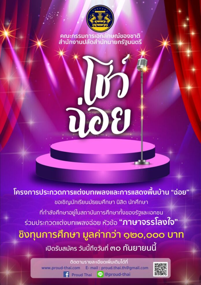 ข่าวดีสำหรับๆ น้องๆ ในระดับมัธยม และอุดมศึกษาที่มีความสนใจในศิลปของชาติไทยอย่างเพลงฉ่อย คณะกรรมการเอกลักษณ์ของชาติ สำนักงานปลัดสำนักนายกรัฐมนตรีขอเชิญน้อง ๆ ที่กำลังศึกษาอยู่ในระดับมัธยม และอุดมศึกษาร่วมส่งประกวดแต่งบทเพลง “ฉ่อย” หัวข้อ “ภาษาจรรโลงใจ” ชิงทุนการศึกษามูลค่า 120,000 บาทเปิดรับสมัครวันนี้ ถึง 31 กันยายน 2565 สอบถามรายละเอียดได้ที่ :FB : Proud Thai และ Line: @360qkeof