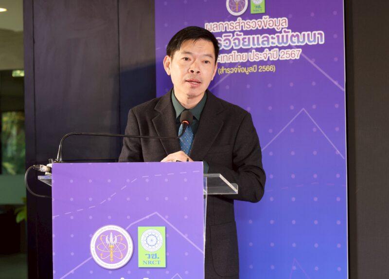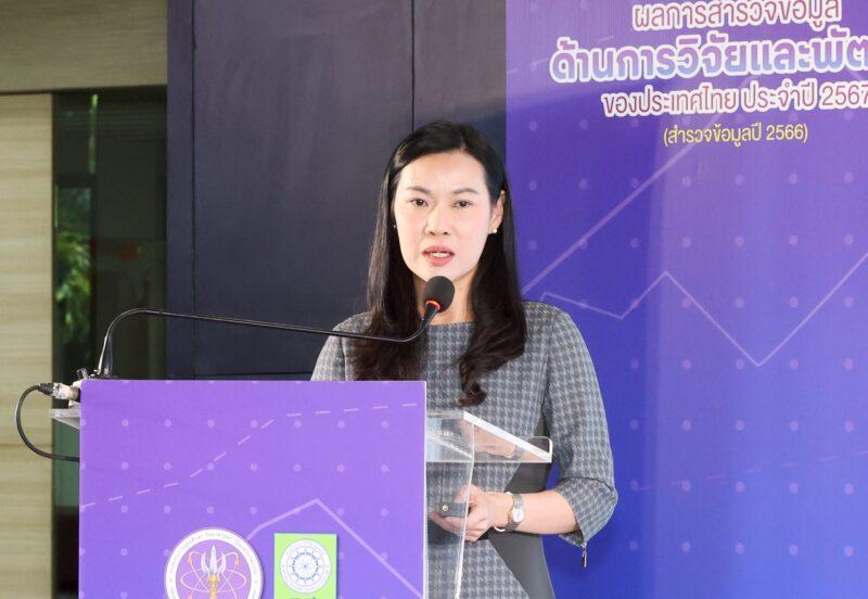 ดร.วิภารัตน์ ดีอ่อง ผู้อำนวยการสำนักงานการวิจัยแห่งชาติ กล่าวว่า ผลสำรวจค่าใช้จ่ายด้านการวิจัยและพัฒนาของประเทศไทย ปี 2567 พบว่า ประเทศไทยมีค่าใช้จ่ายด้านการวิจัยและพัฒนารวมทั้งสิ้น 168,106 ล้านบาท มีอัตราเติบโตลดลงร้อยละ 16.5 เป็นค่าใช้จ่ายด้านการวิจัยและพัฒนาในภาคเอกชน 112,126 ล้านบาท ลดลงร้อยละ 23.4 ในขณะที่ภาคอื่น ๆ (ภาครัฐบาล อุดมศึกษา รัฐวิสาหกิจ และเอกชนไม่ค้ากำไร) มีค่าใช้จ่าย 55,980 ล้านบาท เพิ่มขึ้นร้อยละ 1.6 หรือคิดเป็นสัดส่วนภาคเอกชนต่อภาคอื่นๆ อยู่ที่ร้อยละ 67 : 33