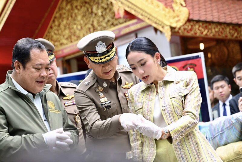 ที่กองบัญชาการตำรวจภูธรภาค 1 (บช.ภ.1) นส.แพทองธาร ชินวัตร นายกรัฐมนตรี และพ.ต.อ.ทวี สอดส่อง รมว.ยุติธรรม พล.ต.อ.กิตต์รัฐ พันธุ์เพ็ชร์ ผบ.ตร. พล.ต.อ.ประจวบ วงศ์สุข รอง ผบ.ตร. พล.ต.ท.สุรพล เปรมบุตร ผบช.ภ.1 พล.ต.ท.ภาณุรัตน์ หลักบุญ เลขาธิการ ป.ป.ส. ร่วมกันแถลงผลการจับกุมผู้ต้องหาพร้อมของกลางยาบ้ากว่า 8.7 ล้านเม็ด ไอซ์ 720 กิโลกรัม