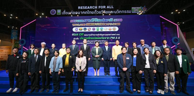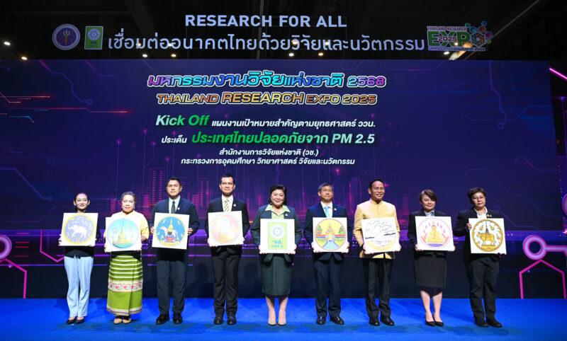 สำนักงานการวิจัยแห่งชาติ(วช.) กระทรวงการอุดมศึกษา วิทยาศาสตร์ วิจัยและนวัตกรรม จัดกิจกรรม “Kick Off แผนงานเป้าหมายสำคัญตามยุทธศาสตร์ ววน. ประเด็น ประเทศไทยปลอดภัยจาก PM2.5 (เป้าหมาย 8 จังหวัดภาคเหนือตอนบน)” ภายในงาน “มหกรรมงานวิจัยแห่งชาติ 2568 (Thailand Research Expo 2025)” โดย ดร.วิภารัตน์ ดีอ่อง ผู้อำนวยการสำนักงานการวิจัยแห่งชาติ เป็นประธาน คุณศิวกร บัวป้อง รองผู้ว่าราชการจังหวัดเชียงใหม่, คุณพัชระ สิมะเสถียร รองผู้ว่าราชการจังหวัดลำปาง, คุณบุญลือ ธรรมธรานุรักษ์ รองผู้ว่าราชการจังหวัดแม่ฮ่องสอน, คุณคุณากร คชหิรัญ รองผู้ว่าราชการจังหวัดแพร่, คุณลักษวรรณ พวงไม้มิ่ง ผู้อำนวยการสำนักงานทรัพยากรธรรมชาติและสิ่งแวดล้อม จังหวัดพะเยา, คุณศุกลรัตน์ จันทร์มณี หัวหน้าสำนักงานจังหวัดลำพูน, คุณสุภาวดี ศิริวรรณ สถิติจังหวัดน่าน และคุณณิชชา ปัญญาบุญ ผู้อำนวยการส่วนอำนวยการ สำนักงานทรัพยากรธรรมชาติและสิ่งแวดล้อม จังหวัดเชียงราย ร่วมกล่าวเจตนารมณ์ความร่วมมือ โดยมีดร.ยุพิน เลิศบุรุษ ผู้อำนวยการกลุ่มขับเคลื่อนแผนงานวิจัยตามเป้าหมาย กล่าววัตถุประสงค์แผนงานฯ ณ เวที Highlight Stage โรงแรมเซ็นทาราแกรนด์ และบางกอกคอนเวนชันเซ็นเตอร์ เซ็นทรัลเวิลด์