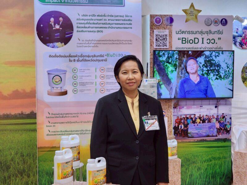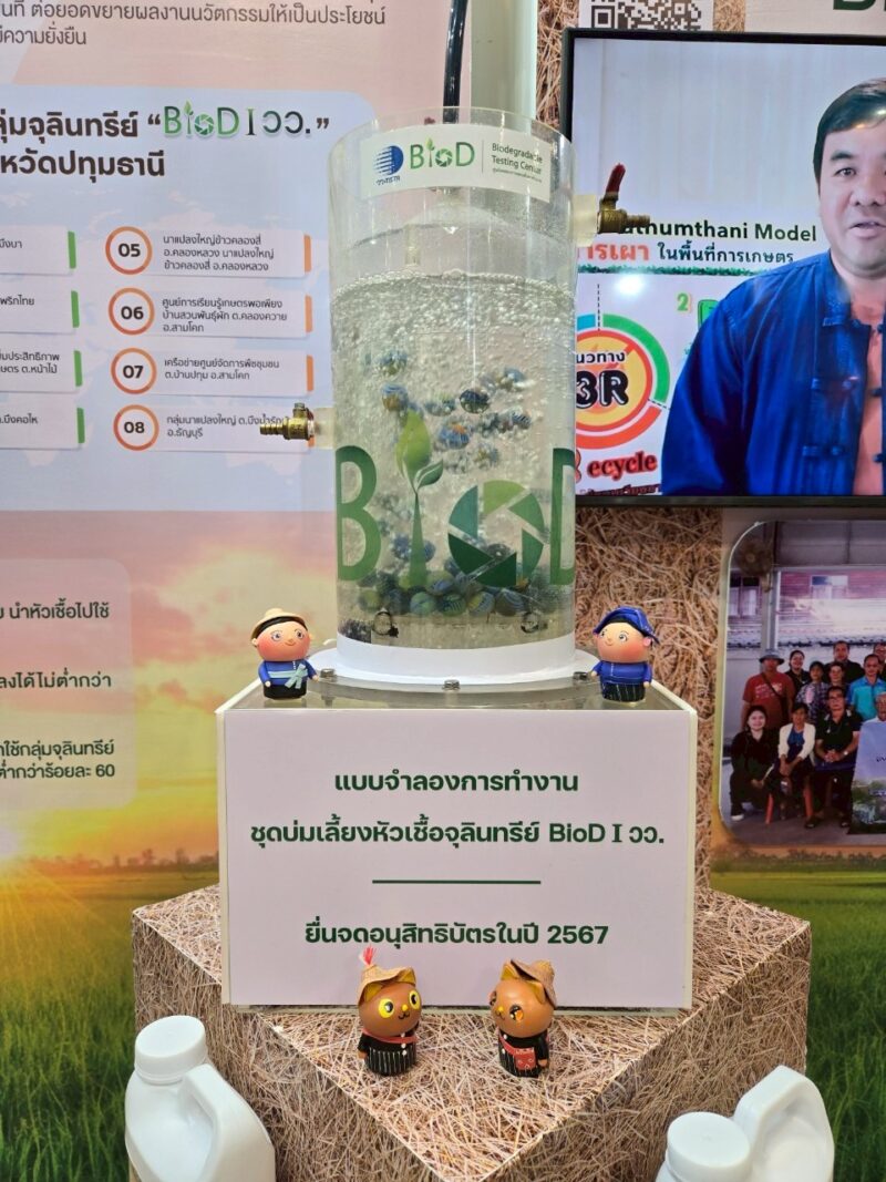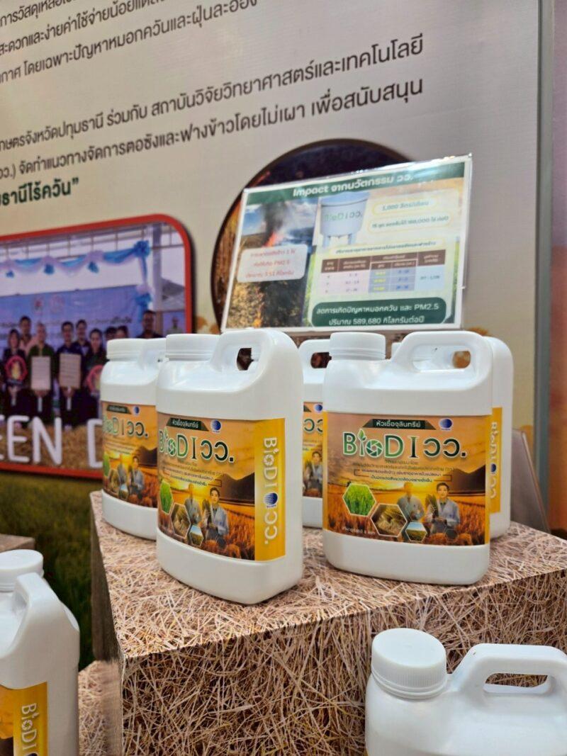 โดยผลงานดังกล่าวประสบผลสำเร็จจากการประยุกต์ใช้กระบวนการฟื้นฟูสิ่งแวดล้อมทางชีวภาพ เพื่อจัดการตอซังและฟางข้าวหลังการเก็บเกี่ยวโดยไม่ต้องเผา ด้วยวิธีการเติมกลุ่มจุลินทรีย์คัดเลือกชื่อ “BioD I วว.” ที่ทำให้ตอซังและฟางข้าวนิ่มลงภายใน 1 สัปดาห์ ไถกลบได้ง่าย เพิ่มธาตุอาหารในดิน และได้ออกแบบชุดบ่มเลี้ยงหัวเชื้อ “BioD I วว.” ขนาด 500 ลิตร ที่สามารถผลิตหัวเชื้อได้อย่างต่อเนื่อง ติดตั้งที่วิสาหกิจชุมชนทั้ง 7 อำเภอในจังหวัดปทุมธานี ให้เกษตรกรสามารถนำไปใช้ได้โดยไม่มีค่าใช้จ่าย อัตราการใช้งานคือ หัวเชื้อ 1 ลิตร นำไปขยายเพิ่มปริมาณเป็น 100 ลิตรภายใน 24 ชั่วโมง ใช้กับพื้นที่นาได้ 5 ไร่ ปัจจุบันมีกลุ่มเกษตรกรมากกว่า 70 ราย นำหัวเชื้อนี้ไปใช้ในแปลงนาประมาณ 2,000 ไร่ ทำให้เกษตรกรลดการใช้ปุ๋ยเคมีลงได้ไม่ต่ำกว่าร้อยละ 20 และคาดว่าปรับเปลี่ยนกลุ่มเกษตรกรให้มาใช้กลุ่มจุลินทรีย์เพื่อย่อยสลายตอซังข้าวทดแทนการเผาได้ไม่ต่ำกว่าร้อยละ 60