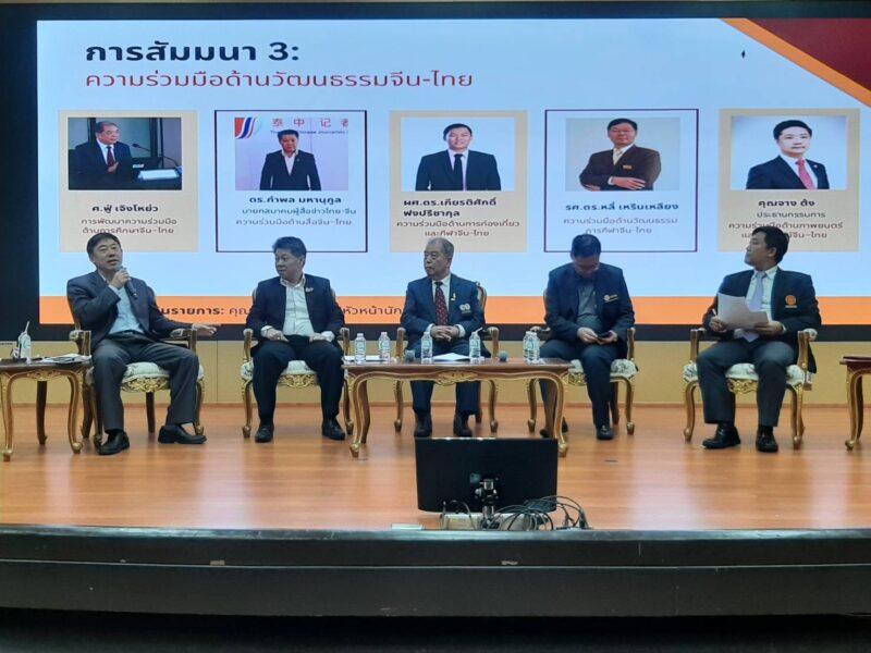 นอกจากนี้ในงานฯ ยังมีการจัดสัมมนาในหัวข้อ “ความร่วมมือด้านวัฒนธรรมจีน-ไทย” ซึ่งมีวิทยากรผู้ทรงคุณวุฒิจากหลากหลายสาขาเข้าร่วมเสวนา โดยเฉพาะในด้านการพัฒนาความร่วมมือด้านการศึกษาจีน–ไทย นำโดย ศ. ฟู่ เจิงโหย่ว และ รศ.ดร.หลี่ เหรินเหลียง ส่วนความร่วมมือด้านสื่อจีน–ไทย ได้รับเกียรติจาก ดร. กำพล มหานุกูล นายกสมาคมผู้สื่อข่าวไทย-จีน ขณะที่ด้านการท่องเที่ยวและกีฬาจีน-ไทย มี ผศ.ดร.เกียรติศักดิ์ ฟงปรีชากุล ร่วมให้ความเห็น ด้านวัฒนธรรมและการกีฬานั้น มี รศ.ดร.หลี่ เหรินเหลียง รองคณบดีฝ่ายวิชาการ คณะพัฒนาสังคมฯ จาก NIDA มาร่วมเสวนา และในส่วนของความร่วมมือด้านภาพยนตร์และโทรทัศน์จีน–ไทย ได้รับเกียรติจาก คุณจาง ต้ง ประธานกรรมการ Artop Media Thailand ผู้ประกอบการด้านภาพยนตร์ไทย-จีน ร่วมแลกเปลี่ยนมุมมอง การเสวนาทั้งหมดนี้ดำเนินรายการโดย ซุน กว่างหย่ง เลขาธิการสมาคมผู้สื่อข่าวไทย-จีน และ ผู้สื่อข่าวจากหนังสือพิมพ์พีเพิลเดลี่