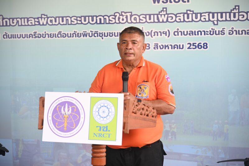 จ่าโทโกเมศร์ ทองบุญชู หัวหน้าศูนย์การจัดการภัยพิบัติตำบลเกาะขันธ์ กล่าวถึง ตำบลเกาะขันธ์ ในพื้นที่เผชิญกับปัญหาน้ำท่วมฉับพลันและดินถล่มเป็นประจำ โดยเฉพาะในฤดูฝนภัยพิบัติเหล่านี้ส่งผลกระทบต่อการดำรงชีวิตและทรัพย์สินของประชาชนอย่างต่อเนื่องแม้ชุมชนมีความพยายามในการเฝ้าระวัง แต่ยังขาดเครื่องมือและระบบเตือนภัยที่ทันสมัยศูนย์การจัดการภัยพิบัติ จึงขอขอบคุณ วช. และสมาคมฯ ที่เล็งเห็นความสำคัญของเทคโนโลยีโดรนในการบริหารจัดการพื้นที่เสี่ยง โดรนจะถูกนำมาสำรวจ และสนับสนุนภารกิจฉุกเฉินรวมถึงการส่งของช่วยเหลือในพื้นที่ห่างไกลหรือเข้าไม่ถึงศูนย์ฯ แห่งนี้จะทำหน้าที่เป็นแหล่งเรียนรู้และพัฒนาทักษะให้กับคนในชุมชนโดยมุ่งหวังให้คนในพื้นที่สามารถใช้เทคโนโลยีรับมือภัยพิบัติได้ด้วยตนเอง