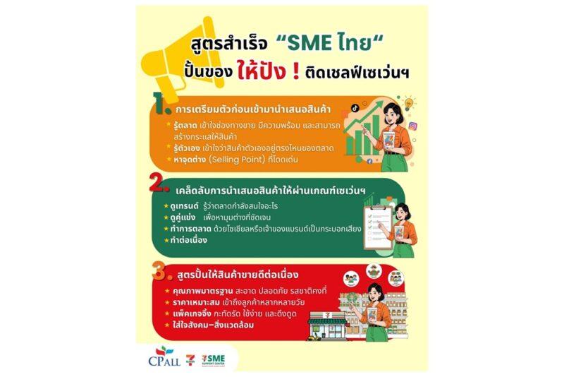 สำหรับ SME ไทย การวางสินค้า ในเซลฟ์เซเว่น อีเลฟเว่น เป็นอีกหนึ่งก้าวสำคัญในการขยายตลาดและสร้างแบรนด์ให้แข็งแกร่ง นั่นคือโอกาสทองในการเข้าถึงผู้บริโภคกว่า 10 ล้านคนต่อวัน จุดสำคัญคือ SME ต้องมีการเตรียมพร้อมรอบด้าน ทั้งคุณภาพสินค้า กลยุทธ์การตลาด และหมัดเด็ดการสร้างไวรัลให้สินค้าติดตลาด ศูนย์เซเว่น อีเลฟเว่น สนับสนุนเอสเอ็มอี ภายใต้การดำเนินงานของ บริษัท ซีพี ออลล์ จำกัด (มหาชน) ผู้บริหารเซเว่น อีเลฟเว่น และเซเว่น เดลิเวอรี่ ร่วมเสริมศักยภาพผู้ประกอบการ SME ให้แข็งแรงและพร้อมแข่งขันในตลาดยุคใหม่ ได้ถอดรหัส “สูตรสำเร็จ SME ไทย ปั้นสินค้าให้ปัง” หากอยากก้าวสู่เชลฟ์เซเว่นฯ และยืนระยะได้ในระยะยาว