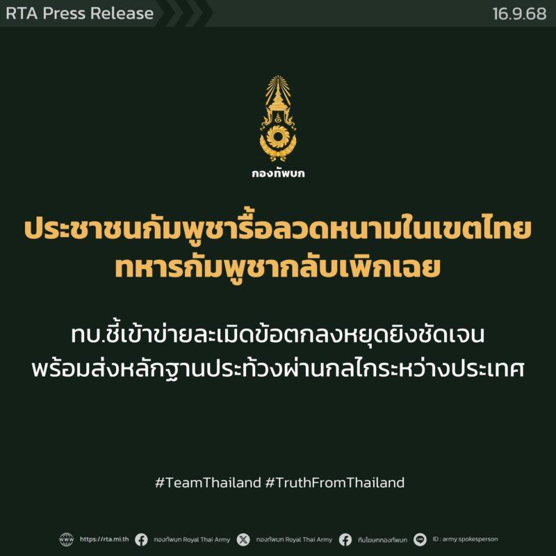 โฆษกกองทัพบกยังได้ย้ำว่า สถานการณ์ดังกล่าวถือว่ามวลชนกัมพูชารุกล้ำเข้ามาในพื้นที่ประเทศไทย ขัดขวางการปฏิบัติงานและทำลายสิ่งของของเจ้าหน้าที่ ซึ่งเป็นการกระทำที่ชัดเจนว่าผิดต่อกฎหมายของประเทศไทยในหลายมาตรา โดยเจ้าหน้าที่ฝ่ายกัมพูชาเพิกเฉยและมิได้ดำเนินการ ห้ามปรามแต่อย่างใด ซึ่งมองว่าสิ่งที่เกิดขึ้นเป็นการยั่วยุ เป็นความตั้งใจที่จะละเมิดในข้อตกลงหยุดยิงโดยให้ประชาชนเป็นผู้ออกหน้า