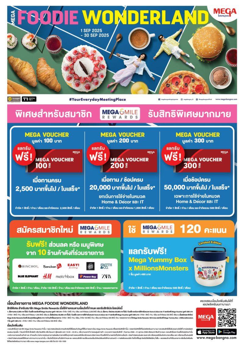 ศูนย์การค้าเมกาบางนา แหล่งช้อปปิ้งที่ใหญ่ที่สุดแห่งกรุงเทพฯ ฝั่งตะวันออก พร้อมเติมเต็มประสบการณ์การใช้ชีวิตให้ทุกๆ วันมีความสุขมากยิ่งขึ้น ด้วยแนวคิด YOUR EVERYDAY MEETING PLACE ตอกย้ำความยิ่งใหญ่แห่งความเป็น ‘FOOD DESTINATION’ ของกรุงเทพฯ ตะวันออก จัดแคมเปญ “MEGA FOODIE WONDERLAND” ตั้งแต่วันที่ 1 – 30 กันยายน 2568 ชวนสายชิมสายช้อปออกเดินทางสู่โลกแห่งความอร่อยสุดมหัศจรรย์ จากร้านอาหารหลากหลายสไตล์ที่คัดสรรมาอย่างครบครัน ทั้งไทย จีน ญี่ปุ่น เกาหลี ตะวันตก คาเฟ่ และของหวาน เอาใจทุกไลฟ์สไตล์ความอร่อยในที่เดียวจากร้านอาหารแบรนด์ดังกว่า 200 ร้าน พร้อมไฮไลต์สุดพิเศษ! เพียงใช้คะแนนเมกา สไมล์ รีวอร์ดส 120 คะแนน แลกรับฟรี! “MEGA YUMMY BOX X MILLIONSMONSTER” กล่องเก็บความอร่อยลายลิมิเต็ด อิดิชัน ออกแบบโดย “AnOfficerDies” หรือ กอล์ฟ – ฐิติภูมิ เพ็ชรสังข์ฆาต ศิลปินนักวาดภาพประกอบชื่อดังเจ้าของลายเส้น “Millionsmonster” ภายใต้แคมเปญ “MEGA FOODIE WONDERLAND” สมาชิกเมกา สไมล์ รีวอร์ดส เตรียมรับความคุ้มค่าแบบจัดเต็มกับสิทธิพิเศษมากมาย เพียงรับประทานอาหารหรือช้อปปิ้งครบตามเงื่อนไข แลกรับ MEGA VOUCHER ได้ทันที