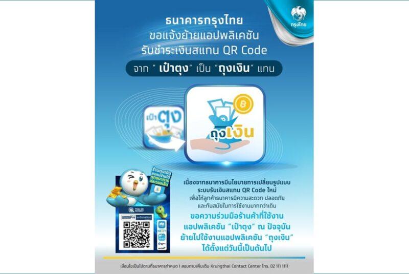 วันที่ 4 ตุลาคม 2568 ธนาคารกรุงไทย แจ้งว่า ได้ย้ายแอพพลิเคชันชำระเงินสแกน QR code จากเป๋าตุงเป็นถุงเงิน เพื่อให้ลูกค้าธนาคารมีความสะดวก ปลอดภัย และทันสมัย ในการใช้งานมากกว่าเดิม โดยท่านสามารถดำเนินการย้ายไปใช้งานได้ ตั้งแต่วันนี้เป็นต้นไป เพื่อให้เป็นไปตามแนวนโยบายของธนาคารแห่งประเทศไทย (ธปท.) ที่ต้องการแยก Tag ของ QR Code ในการบริการให้ชัดเจน โดยแอพพลิเคชั่นสำหรับร้านค้าที่รับชำระค่าสินค้า และบริการ ต้องใช้ QR Code tag 30 ใหม่เท่านั้น