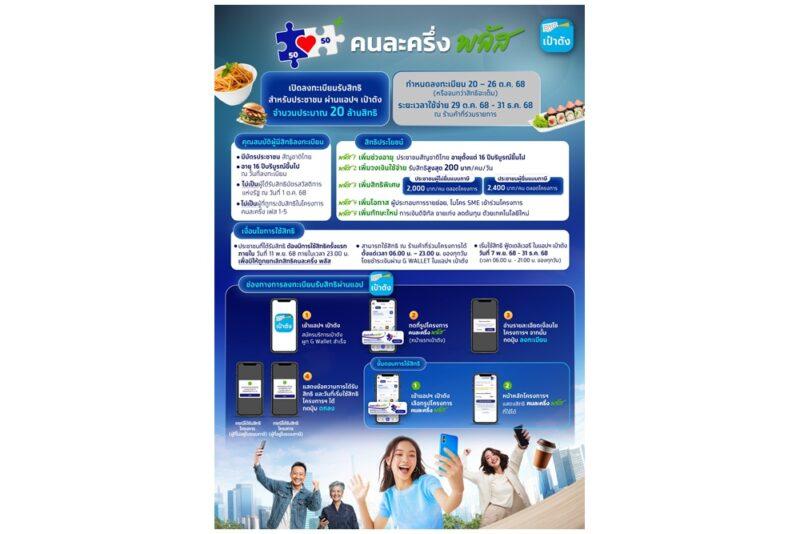 ภาครัฐสนับสนุนเงินร่วมจ่ายค่าอาหาร เครื่องดื่ม สินค้า และบริการที่กำหนด ให้แก่ประชาชนกลุ่มเป้าหมายจำนวนไม่เกิน 20 ล้านคน ในอัตราร้อยละ 50 ทั้งนี้ ไม่เกิน 200 บาทต่อคนต่อวัน แต่ไม่เกินจำนวนวงเงินสิทธิที่กำหนด โดยประชาชนผู้ยื่นแบบ ภ.ง.ด. 90 ภ.ง.ด. 91 หรือ ภ.ง.ด. 95 ในปีภาษี 2567 จะได้รับวงเงินสิทธิไม่เกิน 2,400 บาทต่อคน และประชาชนทั่วไปจะได้รับวงเงินสิทธิไม่เกิน 2,000 บาทต่อคน ตลอดระยะเวลาใช้จ่ายของโครงการฯ ซึ่งประชาชนกลุ่มเป้าหมายสามารถใช้สิทธิในโครงการฯ ผ่านแอปพลิเคชัน “เป๋าตัง” เพื่อซื้ออาหาร เครื่องดื่ม สินค้า และบริการที่กำหนดจากร้านค้าที่เข้าร่วมโครงการฯ หรือซื้ออาหารหรือเครื่องดื่มจากร้านค้าที่เข้าร่วมโครงการฯ ผ่านผู้ให้บริการระบบขนส่งอาหาร (Food Delivery Platform) ที่ได้รับอนุมัติให้เข้าร่วมโครงการฯ โดยรับชำระเงินผ่านแอปพลิเคชัน “ถุงเงิน” ซึ่งกระทรวงการคลังโดยกรมบัญชีกลางจะดำเนินการโอนเงินในส่วนที่ภาครัฐร่วมจ่ายให้แก่ร้านค้าที่เข้าร่วมโครงการฯ ภายในระยะเวลาที่กำหนดต่อไป