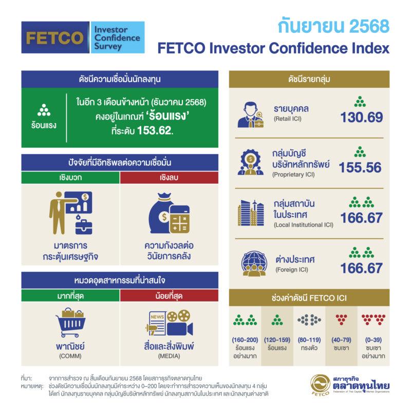 วันที่ 8 ตุลาคม 2568 นายกอบศักดิ์ ภูตระกูล ประธานกรรมการสภาธุรกิจตลาดทุนไทย เปิดเผยดัชนีความเชื่อมั่นนักลงทุน (FETCO Investor Confidence Index) ผลสำรวจในเดือนกันยายน 2568 (สำรวจระหว่างวันที่ 22-30 กันยายน 2568) พบว่า “ดัชนีความเชื่อมั่นนักลงทุน (FETCO Investor Confidence Index: ICI) ในอีก 3 เดือนข้างหน้าคงอยู่ในเกณฑ์ “ร้อนแรง” ที่ระดับ 153.62 นักลงทุนมองว่ามาตรการกระตุ้นเศรษฐกิจของภาครัฐเป็นปัจจัยหนุนความเชื่อมั่นมากที่สุด รองลงมาคือการไหลเข้าของเงินทุน และนโยบายการเงินของธนาคารกลางสหรัฐฯ (FED) ปัจจัยที่ฉุดความเชื่อมั่นนักลงทุนมากที่สุด ได้แก่ ความกังวลต่อวินัยการคลัง รองลงมาคือสถานการณ์การนำเข้าและส่งออก และสถานการณ์เศรษฐกิจยูโรโซน