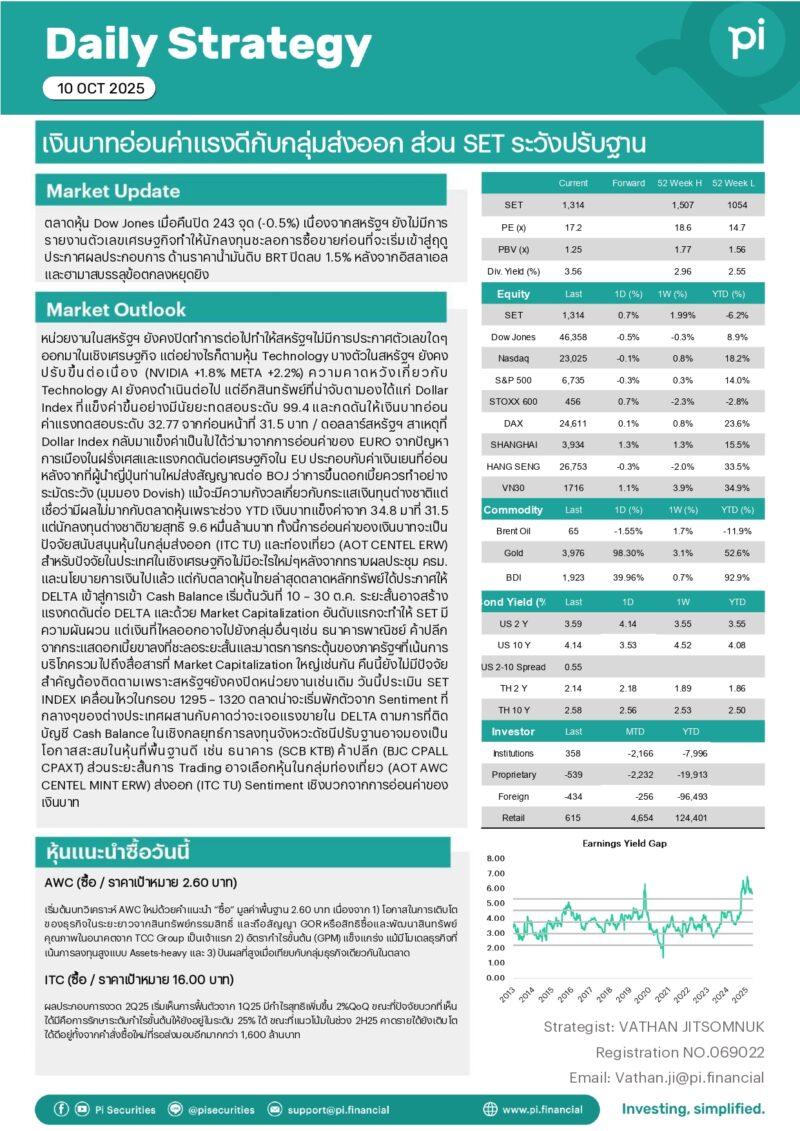 วันที่ 10 ตุลาคม 2568 บล.พายเผยว่า ตลาดหุ้น Dow Jones เมื่อคืนปิด 243 จุด (-0.5%) เนื่องจากสหรัฐฯ ยังไม่มีการรายงานตัวเลขเศรษฐกิจทำให้นักลงทุนชะลอการซื้อขายก่อนที่จะเริ่มเข้าสู่ฤดูประกาศผลประกอบการ ด้านราคาน้ำมันดิบ BRT ปิดลบ 1.5% หลังจากอิสลาเอลและฮามาสบรรลุข้อตกลงหยุดยิง