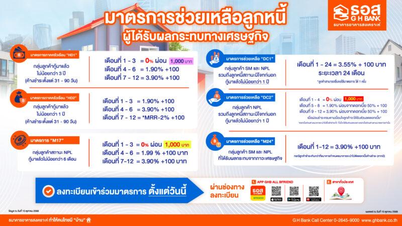ธนาคารอาคารสงเคราะห์ (ธอส.) พร้อมสนับสนุนนโยบายแก้ไขปัญหาเศรษฐกิจของรัฐบาล ด้านการแก้หนี้ประชาชน ผ่าน 6 มาตรการสำหรับลูกค้ากลุ่มที่ต้องเฝ้าระวังเป็นพิเศษ (SM) และลูกค้าสถานะ NPL ที่ยังคงได้รับผลกระทบด้านรายได้ ให้ได้รับความช่วยเหลือนานสูงสุด 2 ปี ผู้ที่สนใจสามารถลงทะเบียนแจ้งความประสงค์เข้าร่วมมาตรการได้ตั้งแต่วันนี้ ผ่าน Application : GHB ALL BFRIEND และสาขาทั่วประเทศ