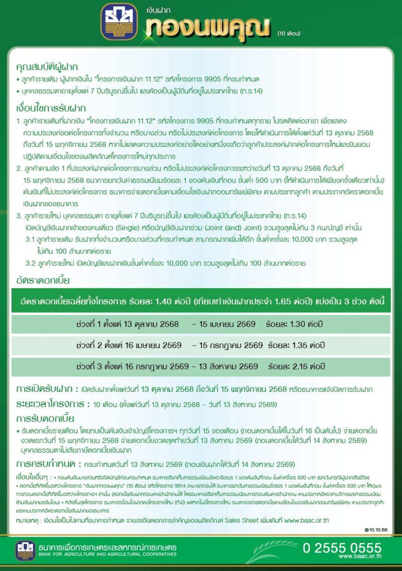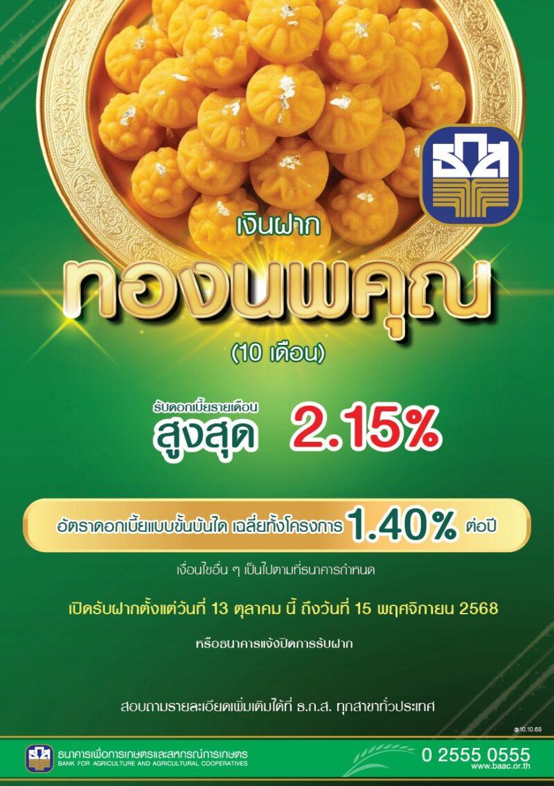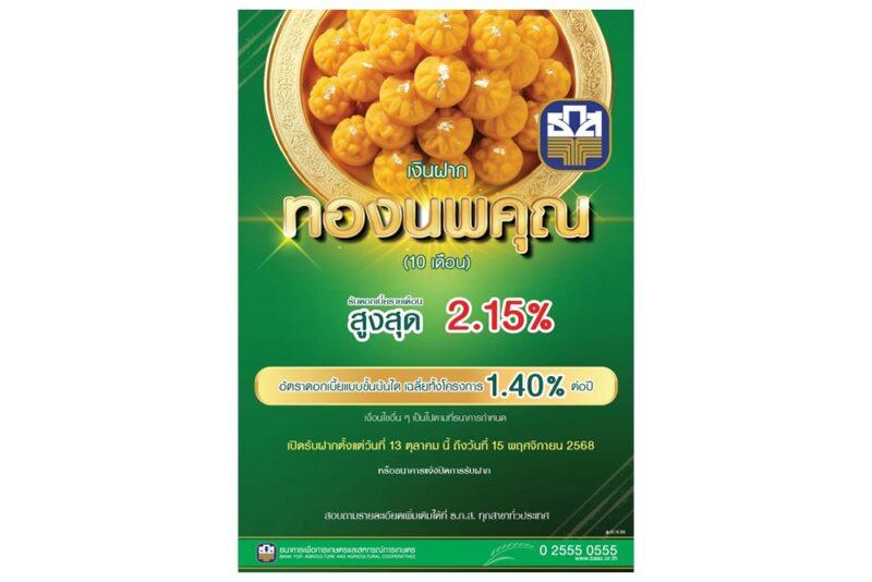 ธ.ก.ส.เปิดตัว “เงินฝากทองนพคุณ” ฝากขั้นต่ำครั้งละ 10,000 บาท วงเงินฝากรวมสูงสุดไม่เกิน 100 ล้านบาทต่อราย รับดอกเบี้ยทุกเดือนแบบขั้นบันได สูงสุดถึงร้อยละ 2.15 ต่อปี เฉลี่ยทั้งโครงการร้อยละ 1.40 ต่อปี ระยะเวลาฝาก 10 เดือน เปิดรับฝากที่ ธ.ก.ส. ทุกสาขาทั่วประเทศ ตั้งแต่วันที่ 13 ตุลาคม 2568 ถึง 15 พฤศจิกายน 2568