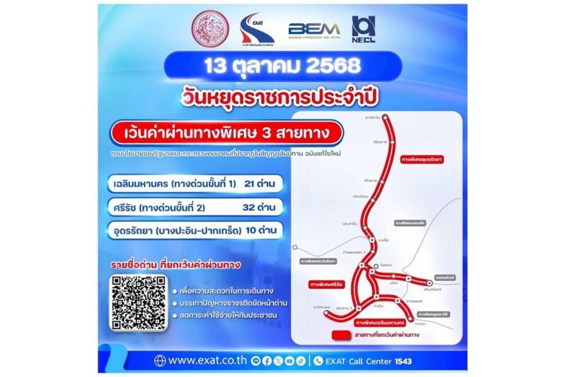 13 ตุลาคม 2568 วันนวมินทรมหาราช กทพ.ขึ้นทางด่วนฟรี 3 สายทาง