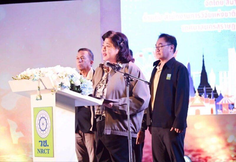 ดร.วิภารัตน์ ดีอ่อง ผู้อำนวยการสำนักงานการวิจัยแห่งชาติ กล่าวสนับสนุนการจัดงานว่า วช. ได้ให้ความสำคัญกับการนำวิจัยและนวัตกรรม ส่งเสริมเทศกาลประเพณีที่เป็นมรดกทางวัฒนธรรมในภูมิภาคต่างๆ ในงานประเพณีชักพระและแข่งเรือยาวของจ.สุราษฏร์ธานี การนำนวัตกรรมโดรนแปรอักษรมาร่วมสนับสนุนกิจกรรมครั้งนี้ ซึ่งถือเป็นส่วนสำคัญของงานประเพณีที่เป็นมรดกทางวัฒนธรรมของภาคใต้ ที่สะท้อนให้เห็นถึงวัฒนธรรม ความศรัทธา และความสามัคคีของชาวสุราษฎร์ธานีที่สืบทอดกันมาอย่างยาวนาน ทั้งยังเป็นโอกาสพิเศษที่จังหวัดสุราษฎร์ธานีได้นำเทคโนโลยีและนวัตกรรมมาผสานกับวัฒนธรรมท้องถิ่นได้อย่างงดงามและลงตัว ผ่านการแสดงโดรนแปรอักษร เพื่อส่งเสริมการท่องเที่ยว สำหรับกิจกรรมการแสดงโดรนแปรอักษรในครั้งนี้ เกิดจากความร่วมมือระหว่างหลายภาคส่วน ทั้งภาครัฐ ภาคการศึกษา และภาคประชาชน ที่ได้มีโอกาสแสดงศักยภาพด้านเทคโนโลยีร่วมกับทีมงานผู้เชี่ยวชาญ ซึ่งได้รับการสนับสนุนจาก วช. โดย วช. ได้ให้ความสำคัญกับการผลักดันงานวิจัยและนวัตกรรมให้เกิดประโยชน์ในระดับพื้นที่ เพื่อสร้างการเรียนรู้และแรงบันดาลใจให้กับคนรุ่นใหม่ในการนำวิทยาศาสตร์และนวัตกรรมมาขับเคลื่อนชุมชน