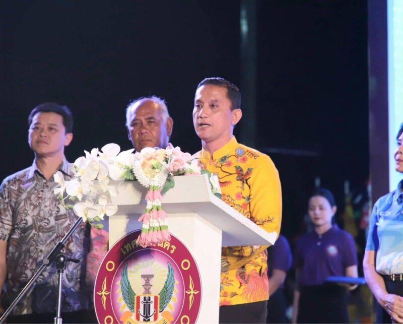 นายหัสชัย เรืองนุ้ย รองนายกเทศมนตรีนครสุราษฎร์ธานี ในนามของท่านนายกเทศมนตรีเมืองสุราษฎร์ธานี รู้สึกเป็นเกียรติและมีความยินดีเป็นอย่างยิ่งที่ได้ต้อนรับทุกท่านสู่งานประเพณีชักพระและแข่งเรือยาว ซึ่งเป็นวัฒนธรรมอันดีงามของจังหวัดสุราษฎร์ธานี เทศบาลเมืองสุราษฎร์ธานี ในฐานะเจ้าภาพการจัดกิจกรรมในค่ำคืนนี้ มีความตั้งใจอย่างยิ่งที่จะสร้างงานประเพณีของเราให้ก้าวไปอีกขั้น เพื่อสร้างความประทับใจและมอบประสบการณ์ใหม่ ๆ ให้กับทั้งพี่น้องชาวสุราษฎร์ธานีและนักท่องเที่ยว การสืบทอดภูมิปัญญาอันล้ำค่าของชาวสุราษฎร์ธานีเป็นการแสดงความพร้อมที่จะสืบสานและเผยแพร่มรดกทางวัฒนธรรม ให้คนรุ่นใหม่ได้ภาคภูมิใจและยังเป็นการต่อยอดทางเศรษฐกิจในท้องถิ่น การสนับสนุนจาก วช. ที่ทำให้ช่วงค่ำคืน มีความสวยงาม และมีเอกลักษณ์ของการท่องเที่ยวของจังหวัดสุราษฎร์ธานี และทุกหน่วยงานที่มีส่วนร่วมในการจัดกิจกรรมในครั้งนี้