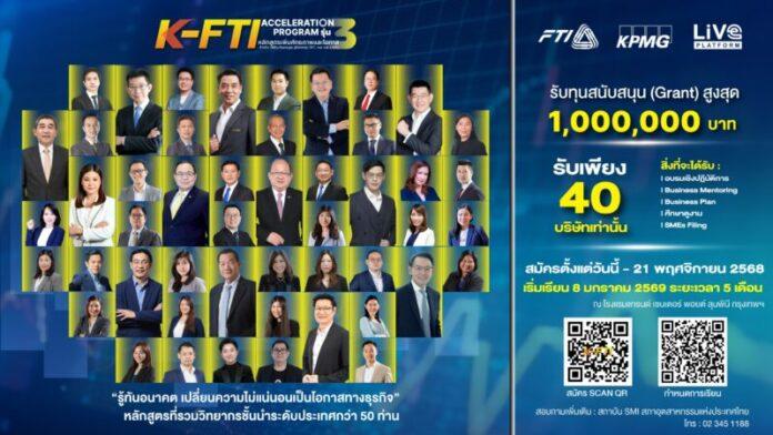 สภาอุตสาหกรรมแห่งประเทศไทย (ส.อ.ท.) ร่วมกับตลาดหลักทรัพย์แห่งประเทศไทย และเคพีเอ็มจี ประเทศไทย เปิดรับสมัครผู้ประกอบการเข้าร่วมโครงการ “K-FTI Acceleration Program รุ่นที่ 3” ภายใต้แนวคิด “รู้ทันอนาคต เปลี่ยนความไม่แน่นอนเป็นโอกาสทางธุรกิจ” เพื่อยกระดับศักยภาพ SMEs และ Startups ไทยให้เติบโตอย่างยั่งยืน พร้อมเข้าถึงแหล่งทุนได้อย่างมีประสิทธิภาพ
