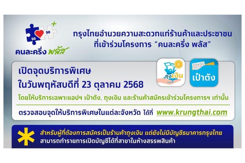 กรุงไทย เปิดจุดบริการพิเศษอำนวยความสะดวกแก่ประชาชนและร้านค้า ผู้เข้าร่วมโครงการคนละครึ่ง พลัสวันพฤหัสบดีที่ 23 ต.ค.68 จำนวน 23 สาขา และ 7 จุดบริการนอกสถานที่