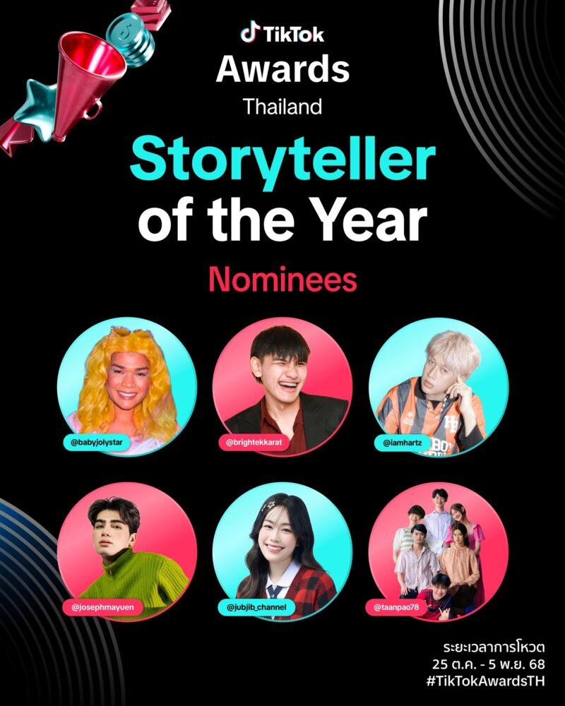 ขณะที่หมวด People’s Choice Awards จะตัดสินจากคะแนนโหวตของผู้ใช้งานบนแพลตฟอร์ม ประกอบด้วย 6 สาขารางวัล โดยเพิ่มเติมรางวัล Rising Star of the Year ครีเอเตอร์ที่มีชื่อเสียงและอิทธิพลเพิ่มขึ้นอย่างรวดเร็วตลอดปีที่ผ่านมา แม้จะเป็นหน้าใหม่ในวงการ แต่ความคิดสร้างสรรค์และพลังของพวกเขาได้ทำให้กลายเป็นครีเอเตอร์ดาวรุ่งที่กำลังเฉิดฉายในโลกของ TikTok และรางวัล Storyteller of the Year ส่งต่อเรื่องราวผ่านคอนเทนต์ที่มีความคิดสร้างสรรค์และโดดเด่นไม่เหมือนใคร