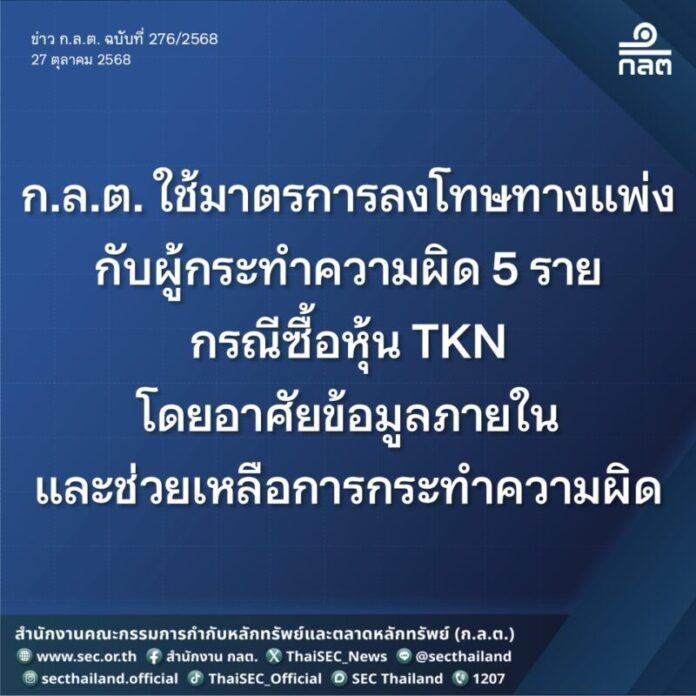 ก.ล.ต. ใช้มาตรการลงโทษทางแพ่งกับผู้กระทำความผิด 5 ราย มีต๊อบเถ้าแก่น้อยด้วยกรณีซื้อหุ้น TKN โดยอาศัยข้อมูลภายใน และช่วยเหลือการกระทำความผิด
