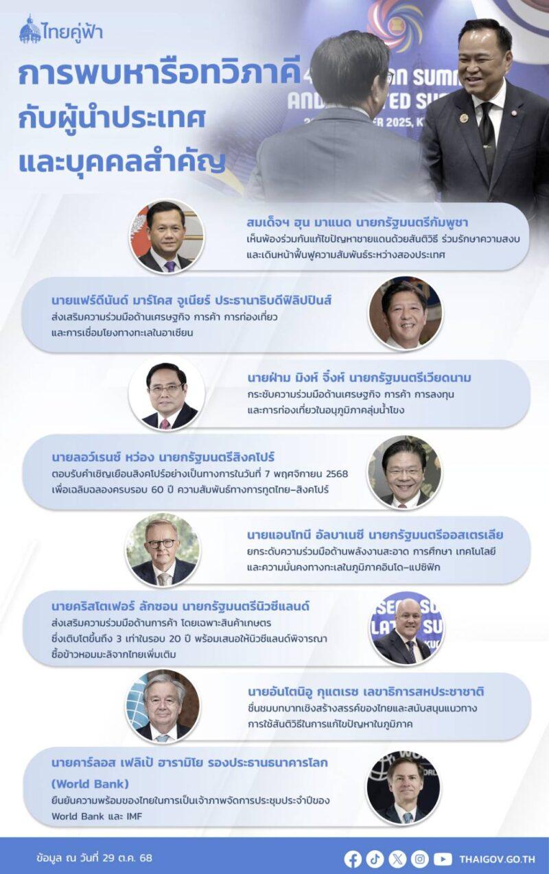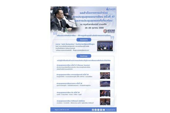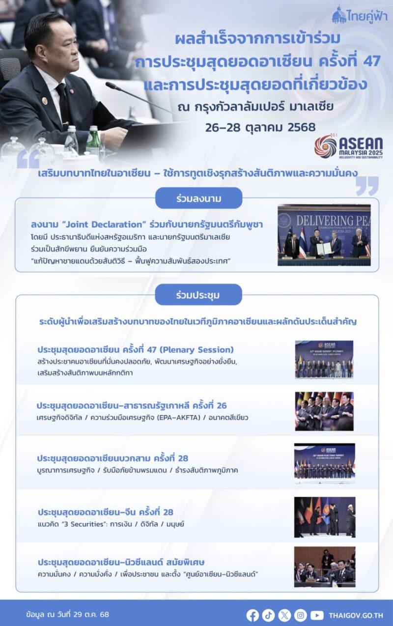 ผลสำเร็จจากการเข้าร่วมการประชุมสุดยอดอาเซียน ครั้งที่ 47 และการประชุมสุดยอดที่เกี่ยวข้อง ณ กรุงกัวลาลัมเปอร์ มาเลเซีย ระหว่าง 26–28 ตุลาคม 2568 โดย กองบรรณาธิการ - 29 ตุลาคม 2568 FacebookTwitterLINE ผลสำเร็จจากการเข้าร่วมการประชุมสุดยอดอาเซียน ครั้งที่ 47 และการประชุมสุดยอดที่เกี่ยวข้อง ณ กรุงกัวลาลัมเปอร์ มาเลเซีย ระหว่าง 26–28 ตุลาคม 2568