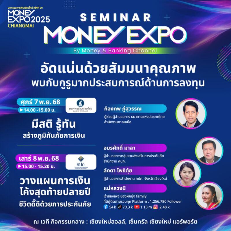 ภายในงานยังมีการจัดกิจกรรมสั มมนาฟรี! ให้ความรู้ด้านการเงินแก่ ประชาชน โดยมีหัวข้อที่น่าสนใจดังนี้ หัวข้อ “มีสติ รู้ทัน สร้างภูมิกันภัยการเงิน” วิทยากรโดย นายก้องภพ ภู่สุวรรณ ผู้ช่วยผู้อำนวยการ ธนาคารแห่งประเทศไทย สำนักงานภาคเหนือ ในวันศุกร์ที่ 7 พฤศจิกายน 2568 เวลา 14.00-15.00 น.และหัวข้อ “วางแผนการเงิน โค้งสุดท้ายปลายปี ชีวิตดี๊ดีด้วยการประกันภัย” วิทยากรโดย นายอมรศักดิ์ มาลา ผู้อำนวยการกลุ่มงานส่งเสริ มการประกันภัย สำนักงาน คปภ.นางลัดดา โพธิตุ้ย ผู้อำนวยการสำนักงาน คปภ.จังหวัดเชียงใหม่ และแม่หลวงนี เจ้าของเพจ ช่องผักบุ้ง family ในวันเสาร์ที่ 8 พฤศจิกายน 2568 เวลา 15.00-15.20 น. โดยสามารถเข้าร่วมฟังสัมมนาได้ ที่ เวทีสัมมนา เชียงใหม่ ฮอลล์ ศูนย์การค้าเซ็นทรัล เชียงใหม่ แอร์พอร์ต หรือรับชมในรูปแบบ LIVE ทางแฟนเพจ Money Expo นอกจากนี้ ยังมีกิจกรรมสุดเอ็กซ์คลูซี ฟจากศิลปินสาวชาวเหนือ ลานนา คัมมินส์ ในวันเสาร์ที่ 8 พฤศจิกายน 2568 เวลา 14.00 – 14.40 น. ณ บูธ บริษัท ฟิลลิปประกันชีวิต จำกัด (มหาชน)