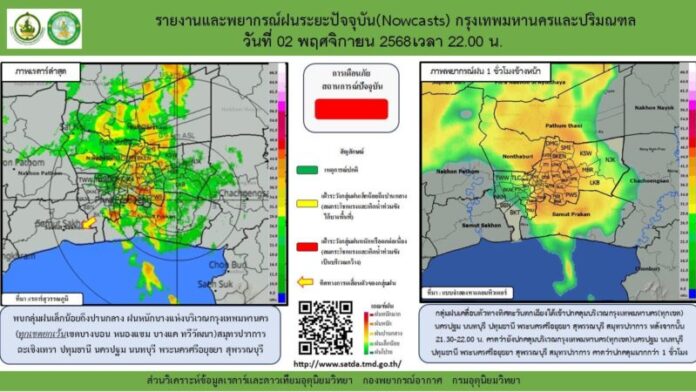 กลุ่มฝนเคลื่อนตัวทางทิศตะวันตกเฉียงใต้เข้าปกคลุมบริเวณกรุงเทพมหานคร(ทุกเขต)นครปฐม นนทบุรี ปทุมธานี พระนครศรีอยุธยา สุพรรณบุรี สมุทรปราการ หลังจากนั้น 21.30-22.00 น. คาดว่ายังปกคลุมบริเวณกรุงเทพมหานคร(ทุกเขต)นครปฐม นนทบุรี ปทุมธานี พระนครศรีอยุธยา สุพรรณบุรี สมุทรปราการ คาดว่าปกคลุมมากกว่า 1 ชั่วโมง