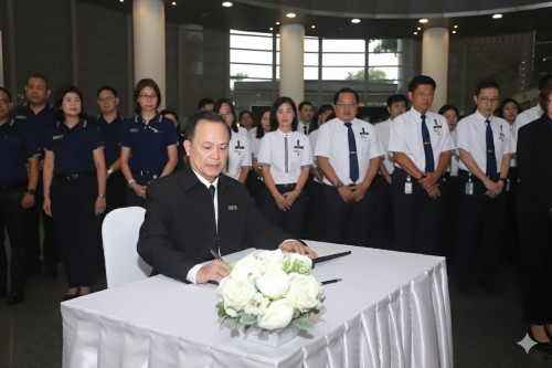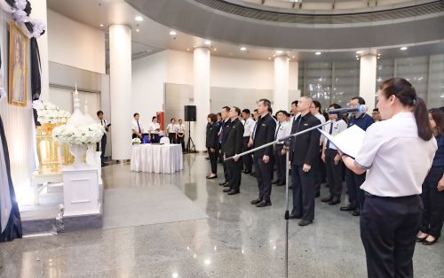ในโอกาสนี้ ดร.สมบัติ กิจจาลักษณ์ ได้วางพวงมาลัยถวายความอาลัยเบื้องหน้าพระฉายาลักษณ์ จากนั้นผู้แทนผู้บริหารและพนักงานได้กล่าวถวายความอาลัย พร้อมยืนสงบนิ่งเพื่อแสดงความจงรักภักดี และน้อมรำลึกในพระมหากรุณาธิคุณอันหาที่สุดมิได้