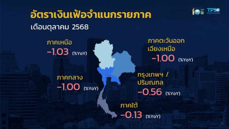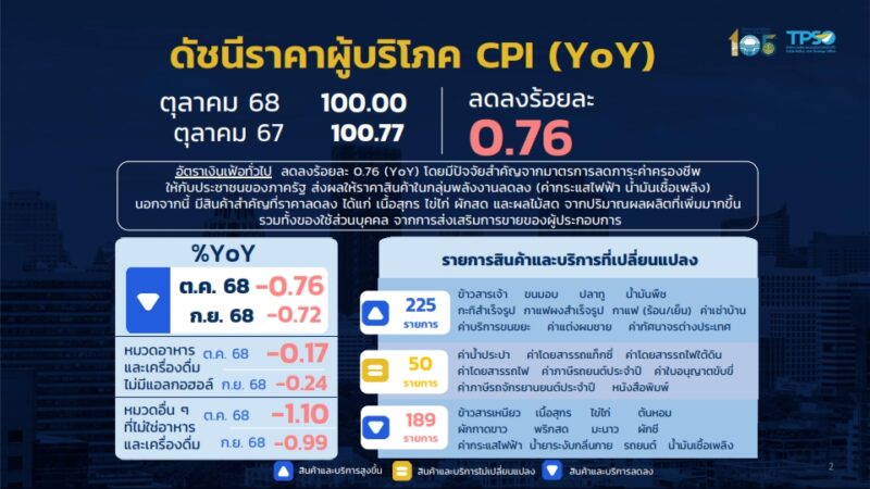 วันที่ 5 พฤศจิกายน 2568 นายนันทพงษ์ จิระเลิศพงษ์ ผู้อำนวยการสำนักงานนโยบายและยุทธศาสตร์การค้า เผยว่า ดัชนีราคาผู้บริโภคทั่วไปของไทย เดือนตุลาคม 2568 เท่ากับ 100.00 เมื่อเทียบกับเดือนตุลาคม 2567 ซึ่งเท่ากับ 100.77 ทำให้อัตราเงินเฟ้อทั่วไปลดลงร้อยละ 0.76 (YoY) โดยปัจจัยหลักมาจากมาตรการลดภาระค่าครองชีพให้กับประชาชนของภาครัฐ ผ่านโครงการ Quick Big Win และสถานการณ์ราคาพลังงานในตลาดโลก ส่งผลให้ราคาสินค้าในกลุ่มพลังงานลดลงทั้งค่ากระแสไฟฟ้าและน้ำมันเชื้อเพลิง นอกจากนี้ มีสินค้าสำคัญที่ราคาลดลง ได้แก่ เนื้อสุกร ไข่ไก่ ผักสด และผลไม้สด จากปริมาณผลผลิตที่เพิ่มมากขึ้น รวมทั้งของใช้ส่วนบุคคล จากการส่งเสริมการขายของผู้ประกอบการ สำหรับราคาสินค้าและบริการอื่นๆส่งผลกระทบต่อภาวะเงินเฟ้อไม่มากนัก